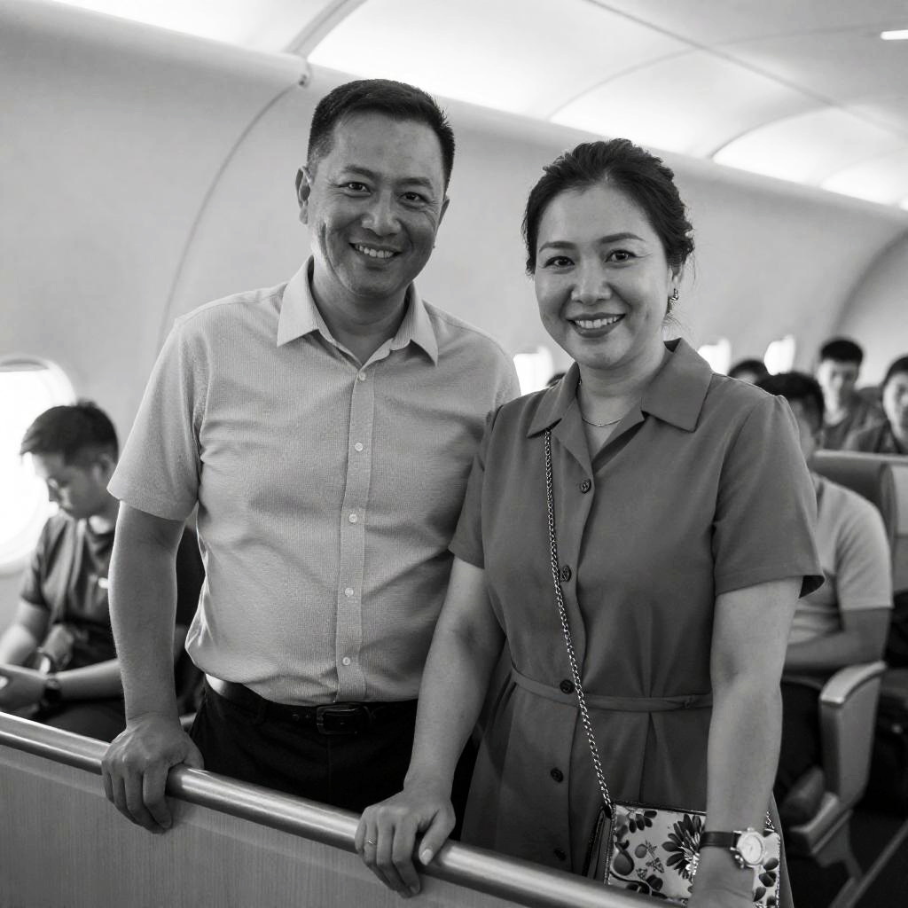 Photograph of four people on a boat. A man in a blue polo shirt waves with a smile, standing left. A woman in a blue shirt stands next to him, smiling. Another woman in a white shirt and wide-brimmed hat raises her hand. A man in a navy shirt and cap raises his hand on the right. Dense green foliage in the background. Boat has white and brown elements, ropes, and a canopy.