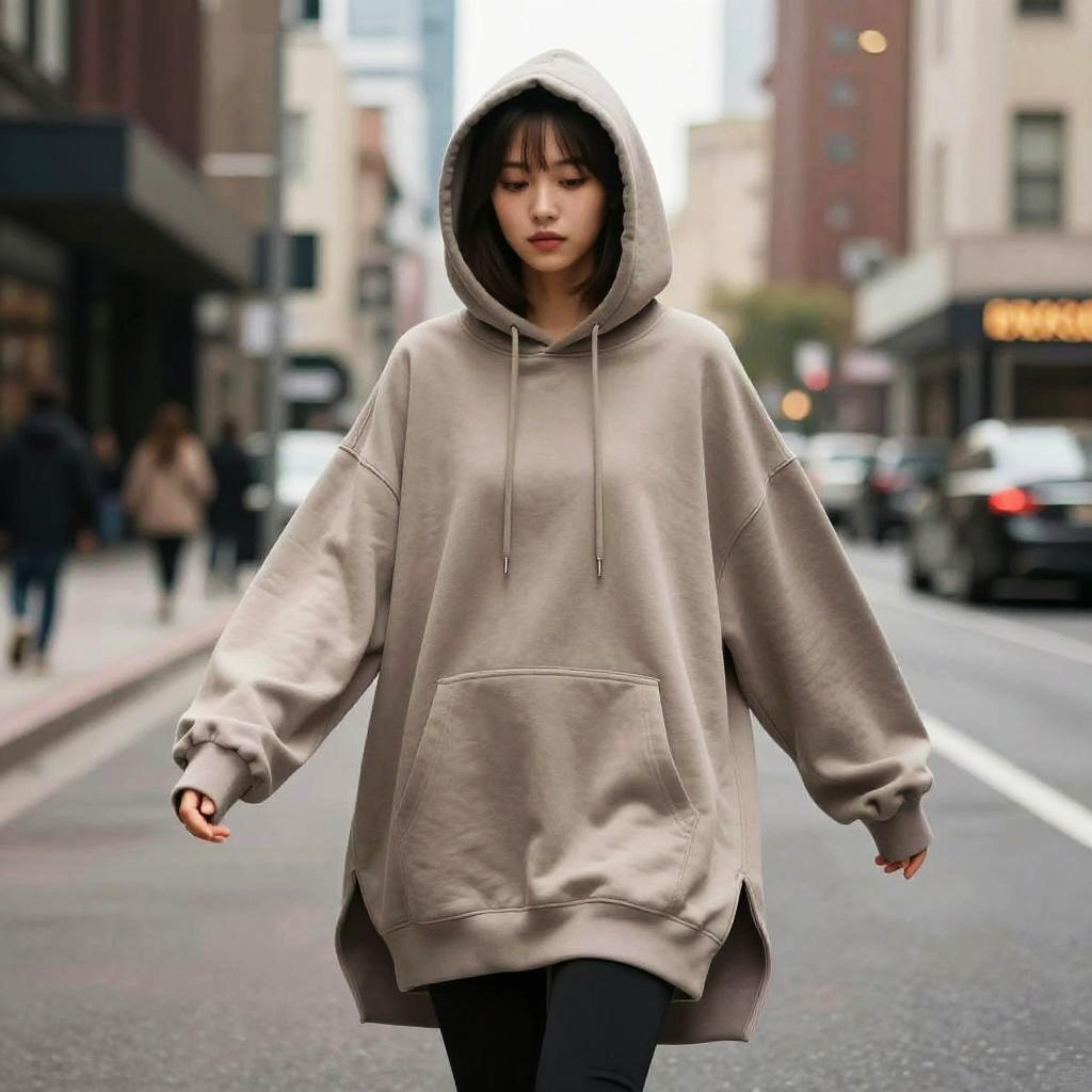 Thoodie fashion piece blending a hoodie and a tunic, street style urban wear with oversized hood and flowing fabric, soft muted tones, cozy texture, casual yet modern accessory, city street background, dynamic lighting