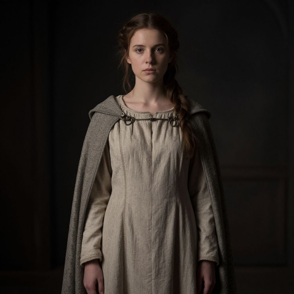 Photograph of a young Caucasian woman with fair skin and brown hair in a simple braid, standing against a dark, almost black background. She wears a long, beige, linen dress with a square neckline and long sleeves, topped with a grey, woolen cloak fastened with black buttons. Her expression is serious and slightly melancholic. The lighting is soft, highlighting her face and upper body, creating subtle shadows that add depth to the image. The overall style is reminiscent of medieval or historical fashion.
