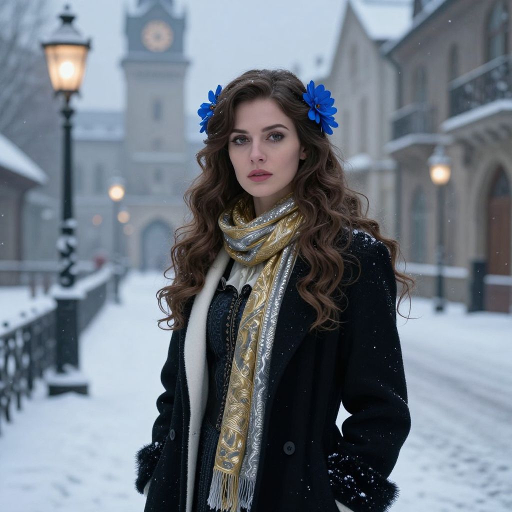 Photograph of a young woman standing in a snowy urban street. She has long, wavy brown hair adorned with a blue flower on each side, and wears a black coat, white scarf, and a gold patterned scarf. Her expression is serious and focused. The background shows snow-covered buildings, a lamppost, and a blurred clock tower. The street is lined with black railings, and the scene is bathed in soft, warm light from the street lamps. The overall atmosphere is cold and wintry, contrasting with the woman's vibrant accessories and detailed scarf.