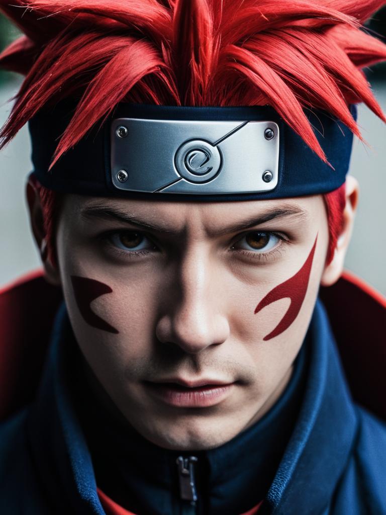 Photorealistic close-up headshot of a man wearing a Naruto Akatsuki-inspired costume featuring a black headband with the Leaf Village symbol, red spiked hair, and red face paint marks on the cheeks. The image captures detailed facial features and intense expression.