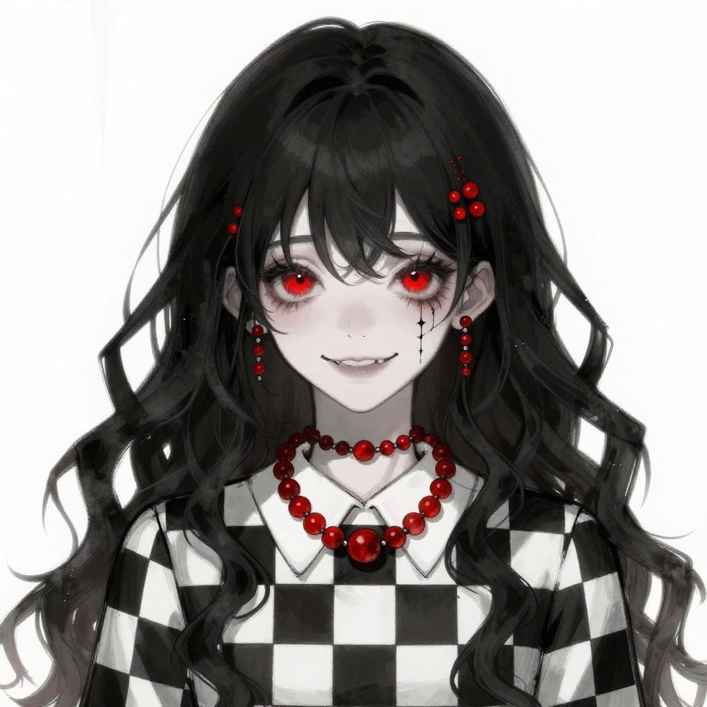 This digital anime-style drawing features a pale-skinned girl with long, wavy black hair adorned with red beads. She has striking red eyes and a subtle, eerie smile. She's wearing a black and white checkered outfit with a white collar and a red bead necklace. The background is plain white with vertical lines. The overall vibe is gothic and slightly unsettling.