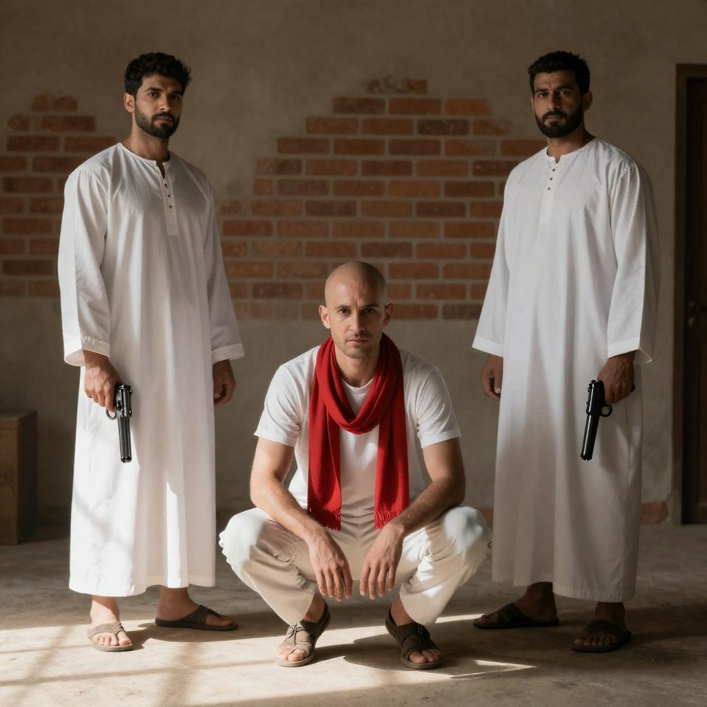 Photograph of six people in traditional costumes. Four men in light blue military-style uniforms with red hats stand to the right, one in a red robe and turban in the center, and a woman in a long red dress and headscarf to the left. They stand in front of a green building, with intense expressions.