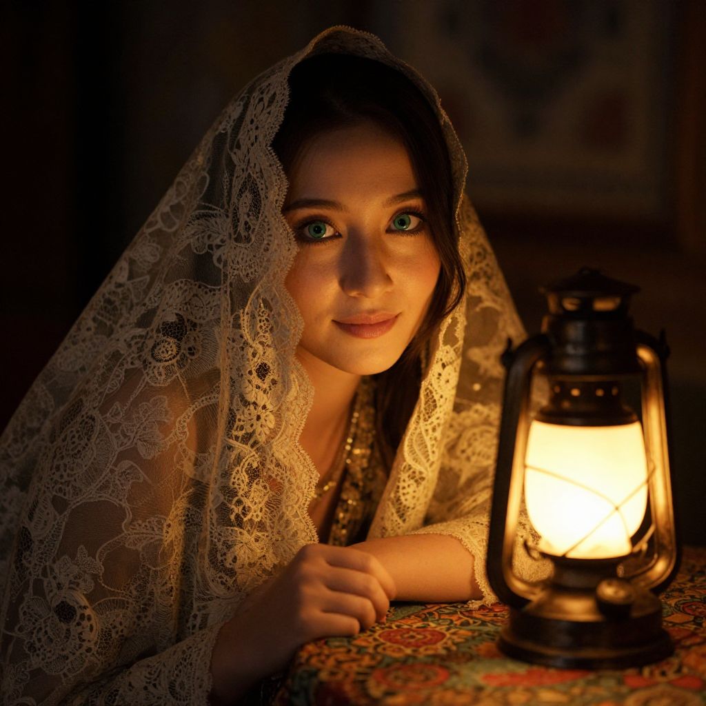 Photograph of a young woman with green eyes, wearing a lace veil, gazing at a glowing lantern on a patterned table. Warm, dim