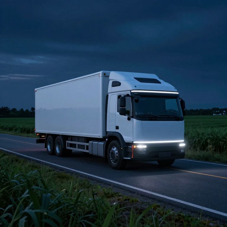 Wide-Angle Interior Photography futuristic autonomous truck, no driver, driving on a country road with green fields behind. realistic. high definition. night time. cinematic.,