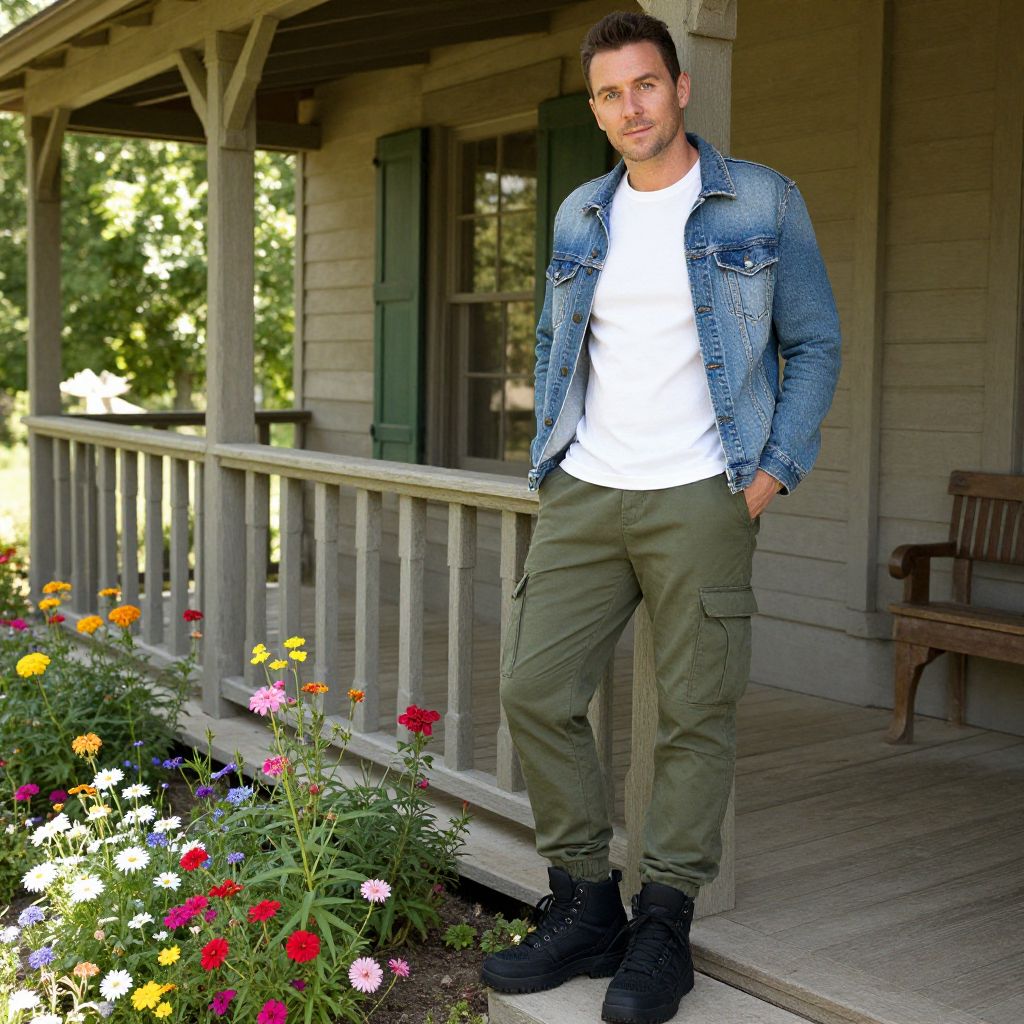 A man, fitted white crew neck t-shirt, olive green cargo joggers, chunky black high-top sneakers, denim jacket, rustic wooden plantation house, wraparound porch, vibrant flower gardens, overhead shot, relaxed pose leaning against the porch railing, casual smile.Man has masculine face and piercing eyes