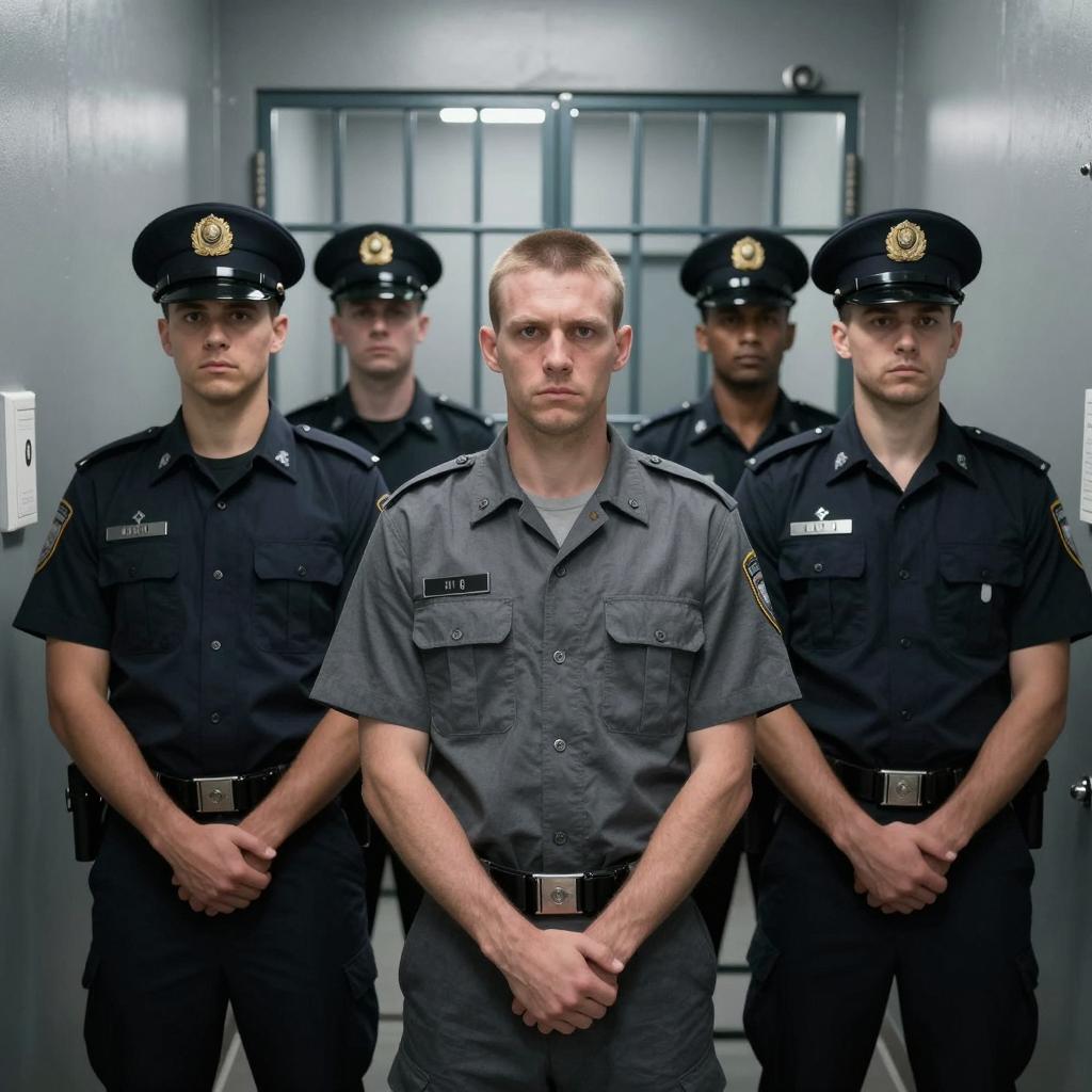 Photograph of a prison cell. Central male inmate with short hair, gray uniform, and name tag, stands with hands in front. Four uniformed guards in dark uniforms with hats stand behind him. Metal walls and barred door in background. Inmate has intense expression. Guards have neutral expressions. Three guards in front, one partially visible behind.