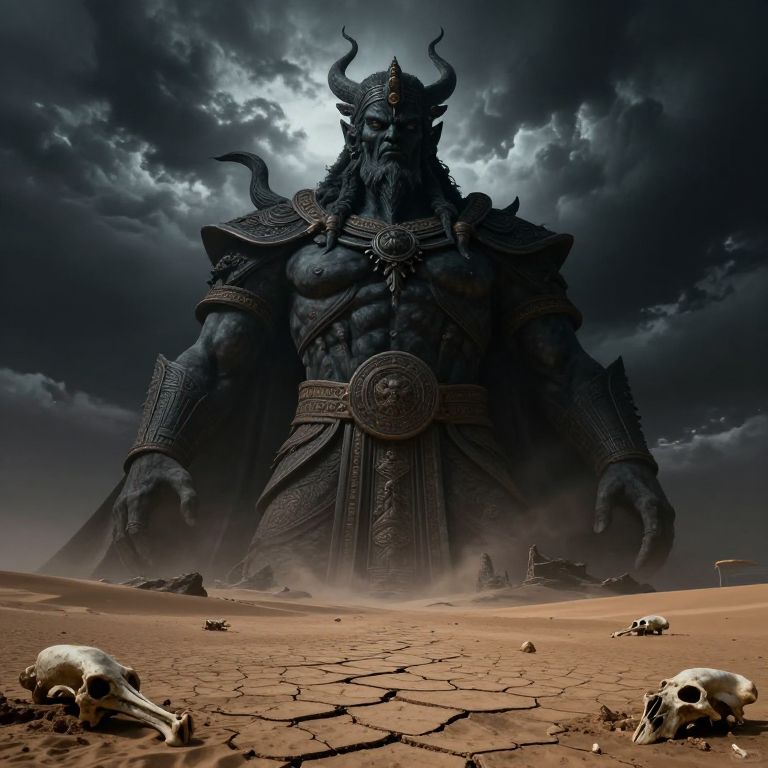 Chemosh, ancient dark god of destruction, towering ominous statue amidst a barren desert, stormy skies overhead, cracked earth with scattered bones, dark fantasy art style, intricate detail, eerie atmosphere, cinematic lighting