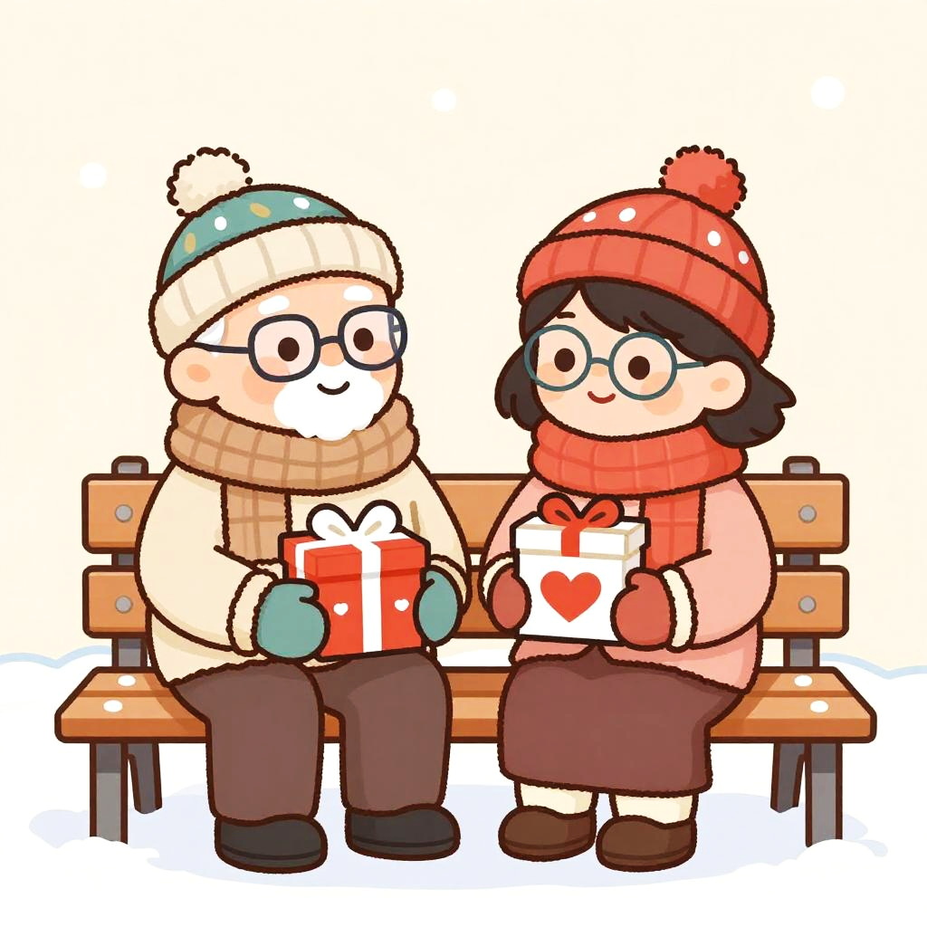 An adorable elderly man and woman sitting on a wooden bench in winter, both wearing glasses and colorful winter clothing such as scarves, gloves, and hats, the man holding a red gift box with white decorations and the woman holding a white gift box with a red heart, snow on the ground, heartwarming and cozy atmosphere, warm pastel colors, cute cartoon caricature style