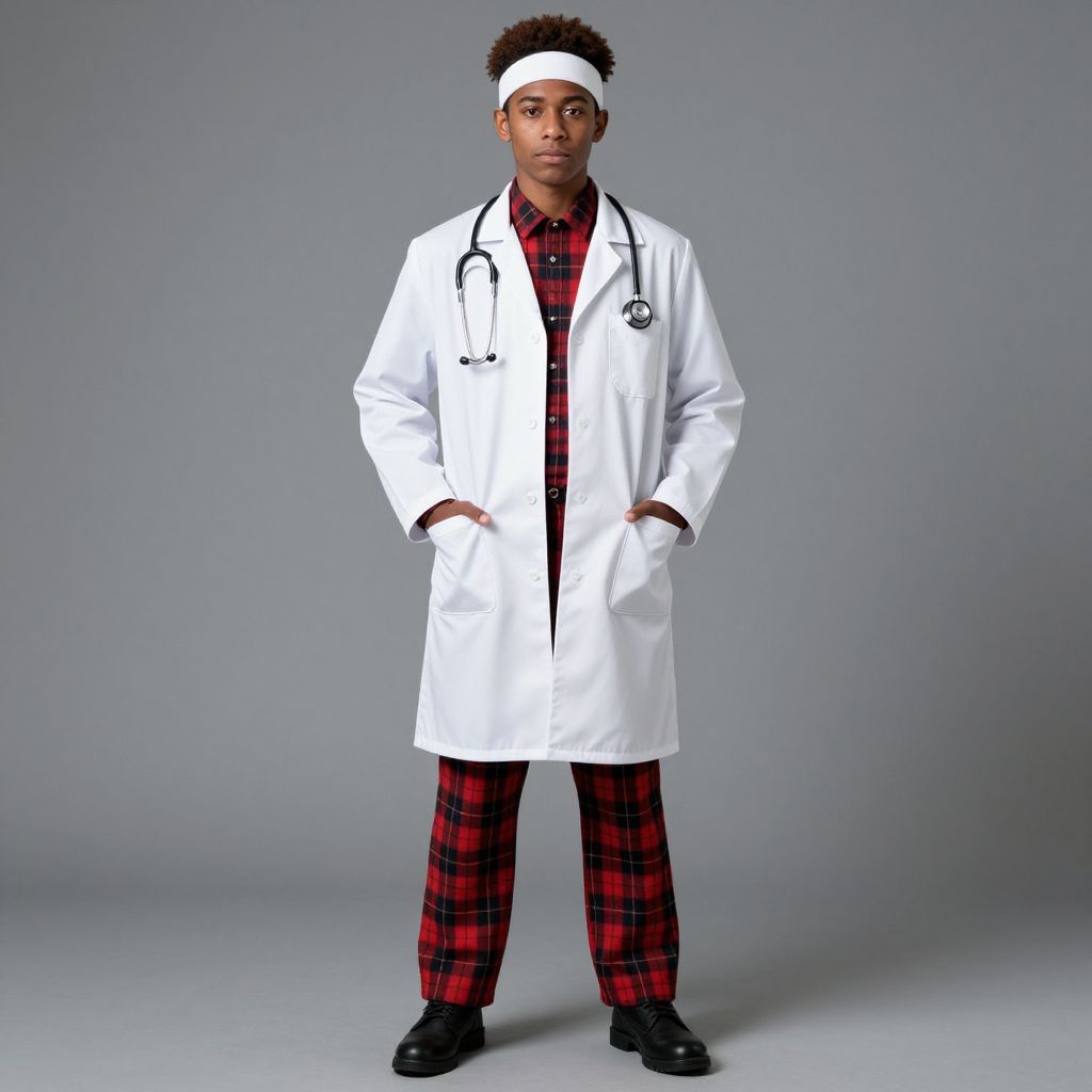 Photograph of a young Black man with short curly hair, wearing a white medical doctor's coat, red and black plaid pajama pants, and a white headband. He has a stethoscope around his neck and stands confidently with hands in his coat pockets. His expression is serious, and he gazes directly at the camera. The background is a plain, light gray studio setting, highlighting his outfit. The contrast between the white coat and red plaid is striking, adding a playful yet professional touch to the image.
