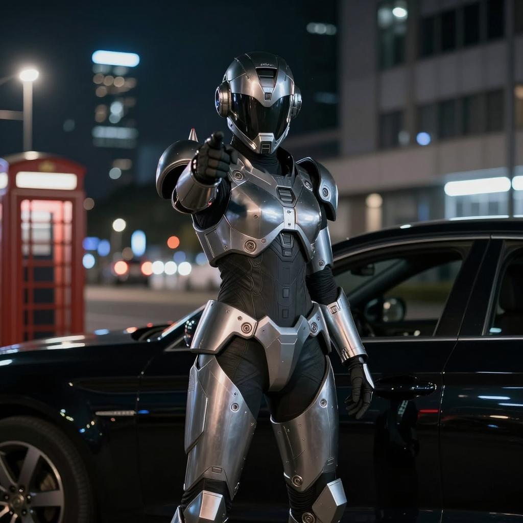 Metallic humanoid figure in black armor with helmet, pointing at a gray rectangular machine with a screen. Bright circular light on left, white walls, and window blinds in background. Figure's right fist clenched. Machine has small screen displaying white light.