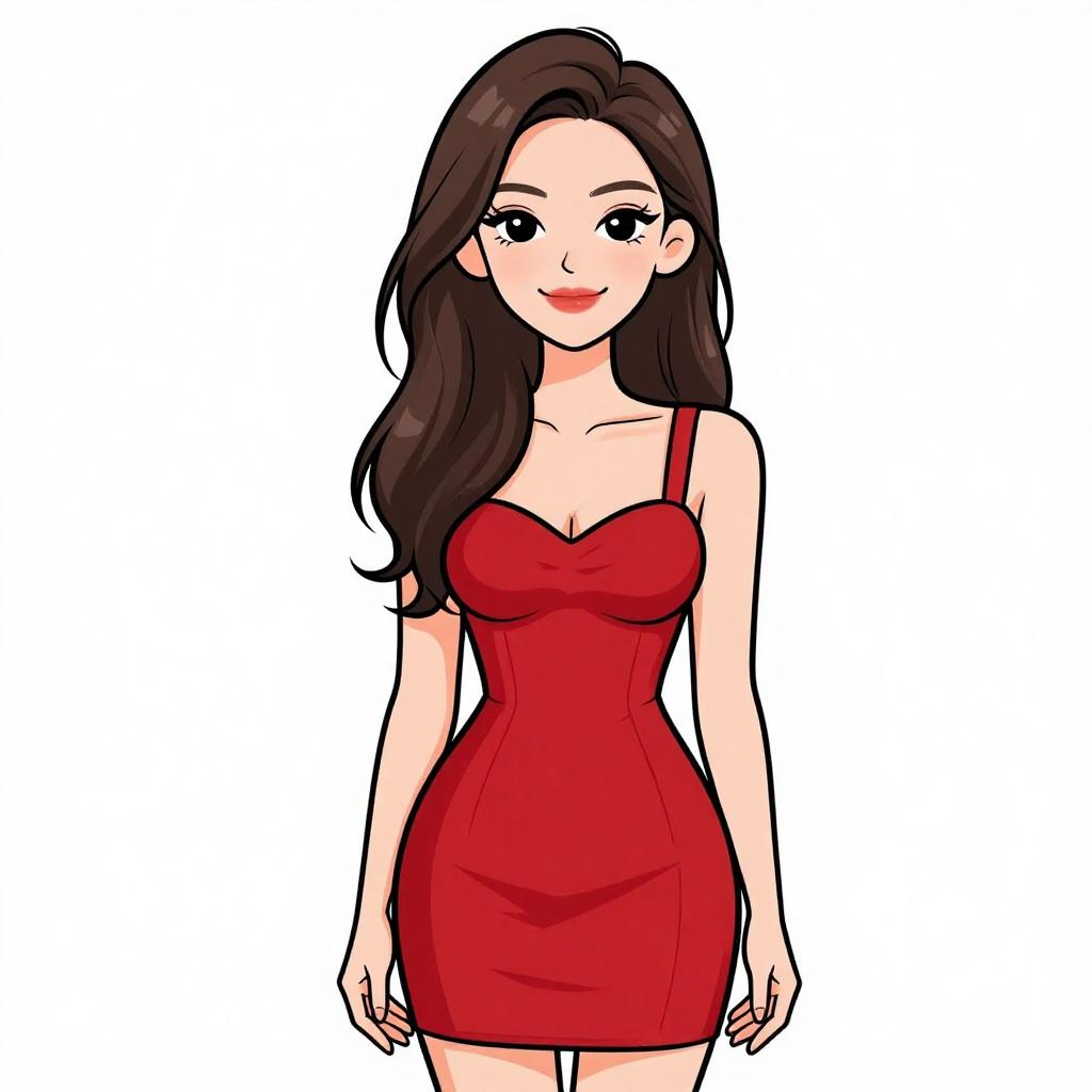 Woman with pretty face and pretty hair. smiling Woman, contemporary, bodycon dress in vibrant red, short cap sleeves, heart-shaped cutout on the chest, ribbed texture, short hemline, silver watch on the left wrist, plain white background. --sref 1467