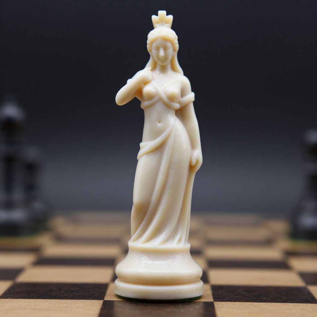Photograph of a white marble chess piece depicting a queen with a crown, standing gracefully with one arm bent and the other resting on her hip. She has a gentle smile and is dressed in a flowing gown that drapes elegantly over her body. The chess piece is centered on a black-and-white checkered chessboard, with blurred chess pieces visible in the background. The background is dark, emphasizing the bright white of the marble queen. The lighting highlights the smooth texture of the marble, creating a subtle shine.