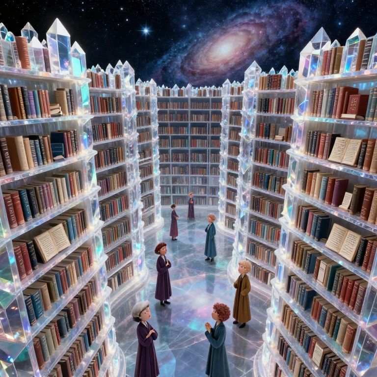 An infinite library stretches across a boundless cosmos in this surreal digital art piece, with towering bookshelves composed entirely of luminous, iridescent crystals that refract light into captivating patterns. Amidst these ethereal shelves, anthropomorphic scholars clad in academic attire display a range of expressions from contemplative curiosity to whimsical intrigue as they study ancient texts etched with alien languages. From an aerial viewpoint, their enigmatic figures create a dynamic atmosphere against a shifting celestial backdrop of starry nights and nebulous galaxies, instilling both wonder and mystery within the observer's imagination.