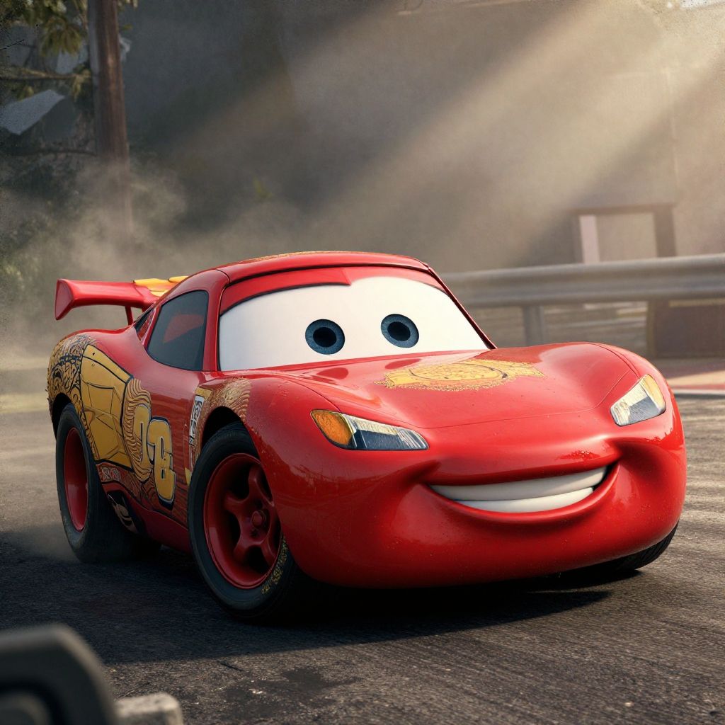 Photograph of a vibrant red, anthropomorphic race car with large eyes and a smiling mouth, featuring yellow racing decals, driving on a dusty street with