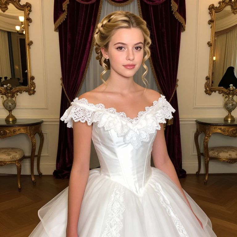 Photorealistic digital image of a young blonde woman with fair skin and a slender build, wearing an off-the-shoulder, white lace wedding dress with a fitted bodice and full skirt. She has her hair styled in an elegant updo with soft curls. The background features a luxurious, ornate room with dark purple curtains, gold-framed mirrors, and antique wooden furniture with upholstered chairs and lamps. The lighting is warm, highlighting the woman's delicate features and the intricate details of her dress. The overall atmosphere is elegant and sophisticated.
