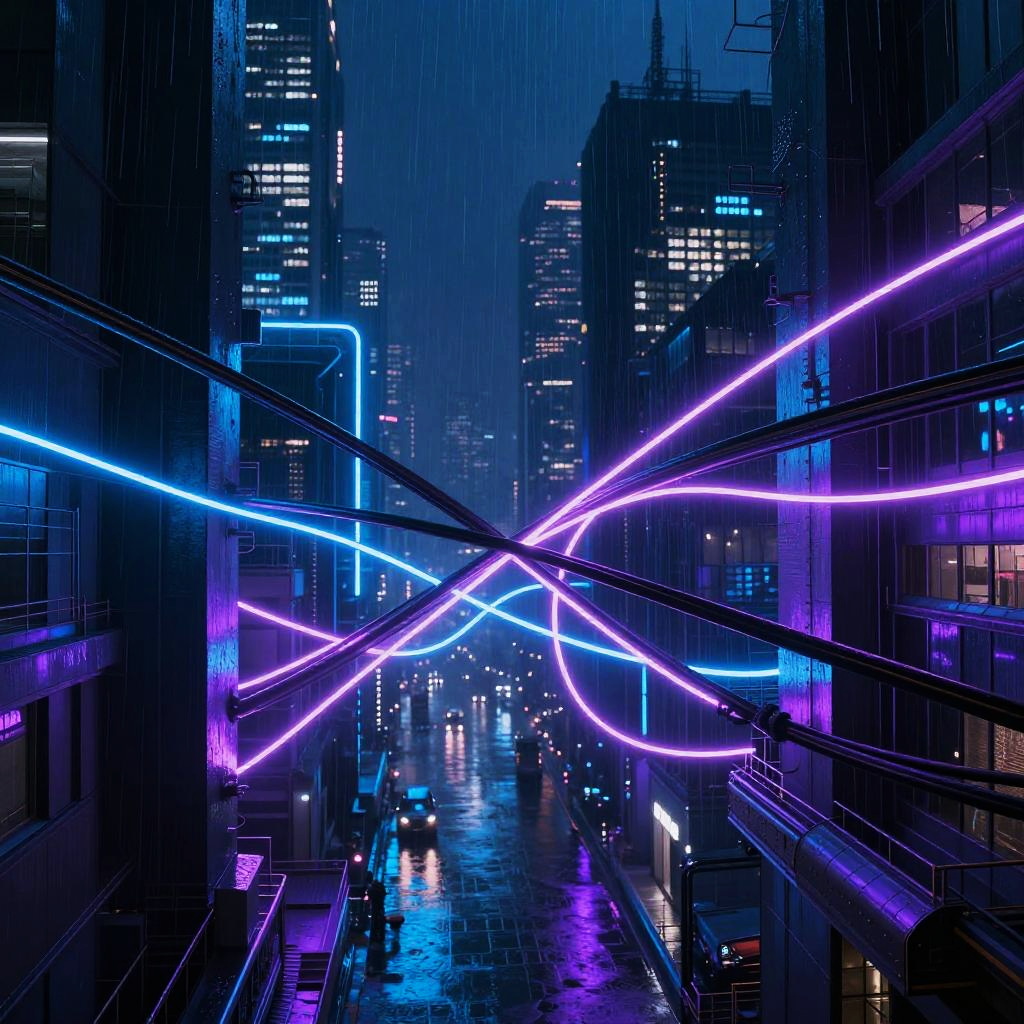 Tangle of glowing neon wires intertwined in a futuristic cyberpunk cityscape at night, rain reflecting vibrant blues and purples, high contrast, intricate details, dynamic lighting, digital art style.