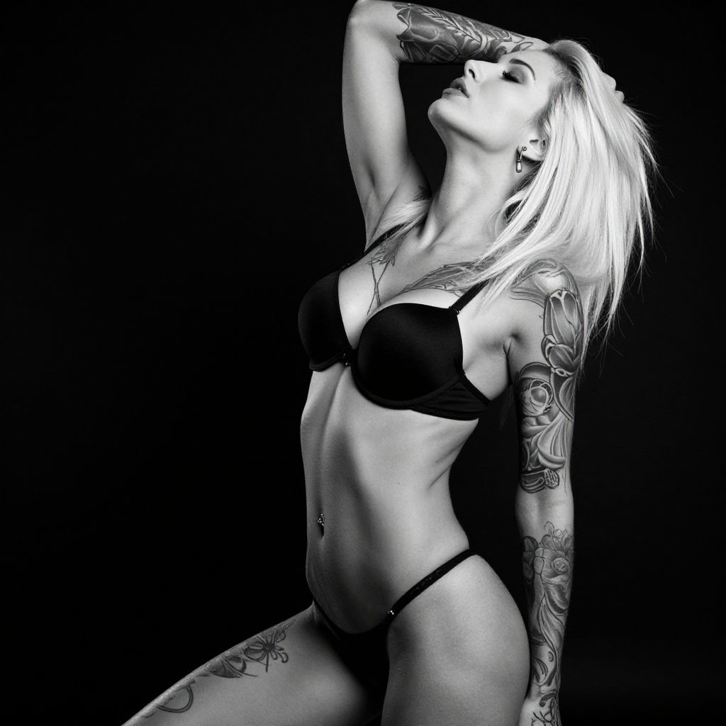 Photograph of a pale-skinned woman with black hair and dark makeup, standing against a white background. She's wearing a leopard print bra and matching thong, along with black lace-top thigh-high stockings. She has colorful tattoos on her right arm. Her pose is confident, with one hand on her hip and the other resting on her thigh. She's looking directly at the camera with a slight smile.