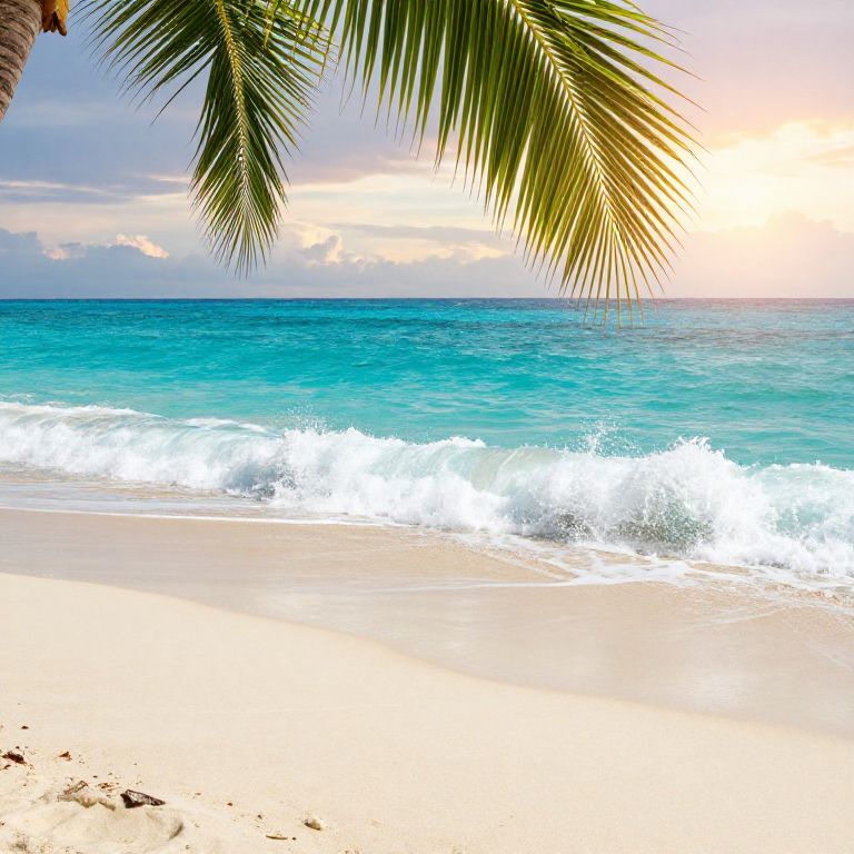 Sandy white beach with turquoise ocean water and gentle waves crashing onto the shore under a warm sunset sky. Green palm leaves hang overhead, adding tropical ambiance to the serene coastal scene.