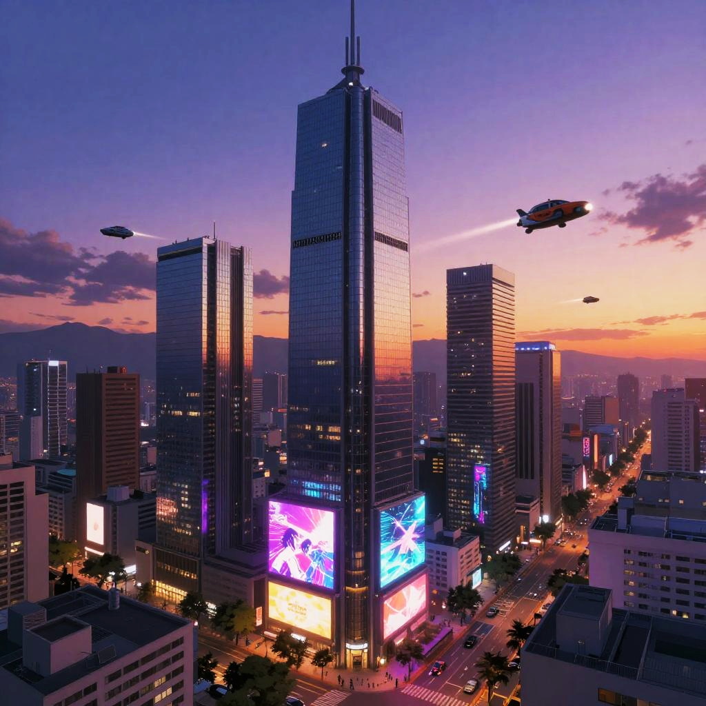 Good anime background showing a futuristic skyline at twilight, sleek skyscrapers with reflective glass surfaces, flying vehicles zooming past, vibrant holographic advertisements illuminating the streets below, and a deep purple and orange gradient sky.
