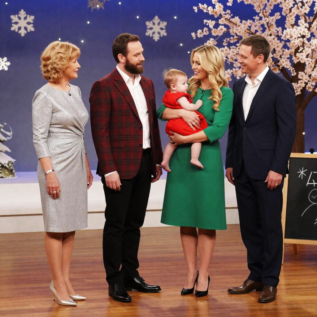 Photograph of a Christmas-themed stage. Blonde woman in red sweater and black pants, mid-speech, standing center. Three children, two boys and one girl, standing to her left. Decorated Christmas tree with lights, presents, and stuffed toys in background. Pink and purple geometric patterned walls. Woman gesturing with hands. Children smiling. Warm lighting.