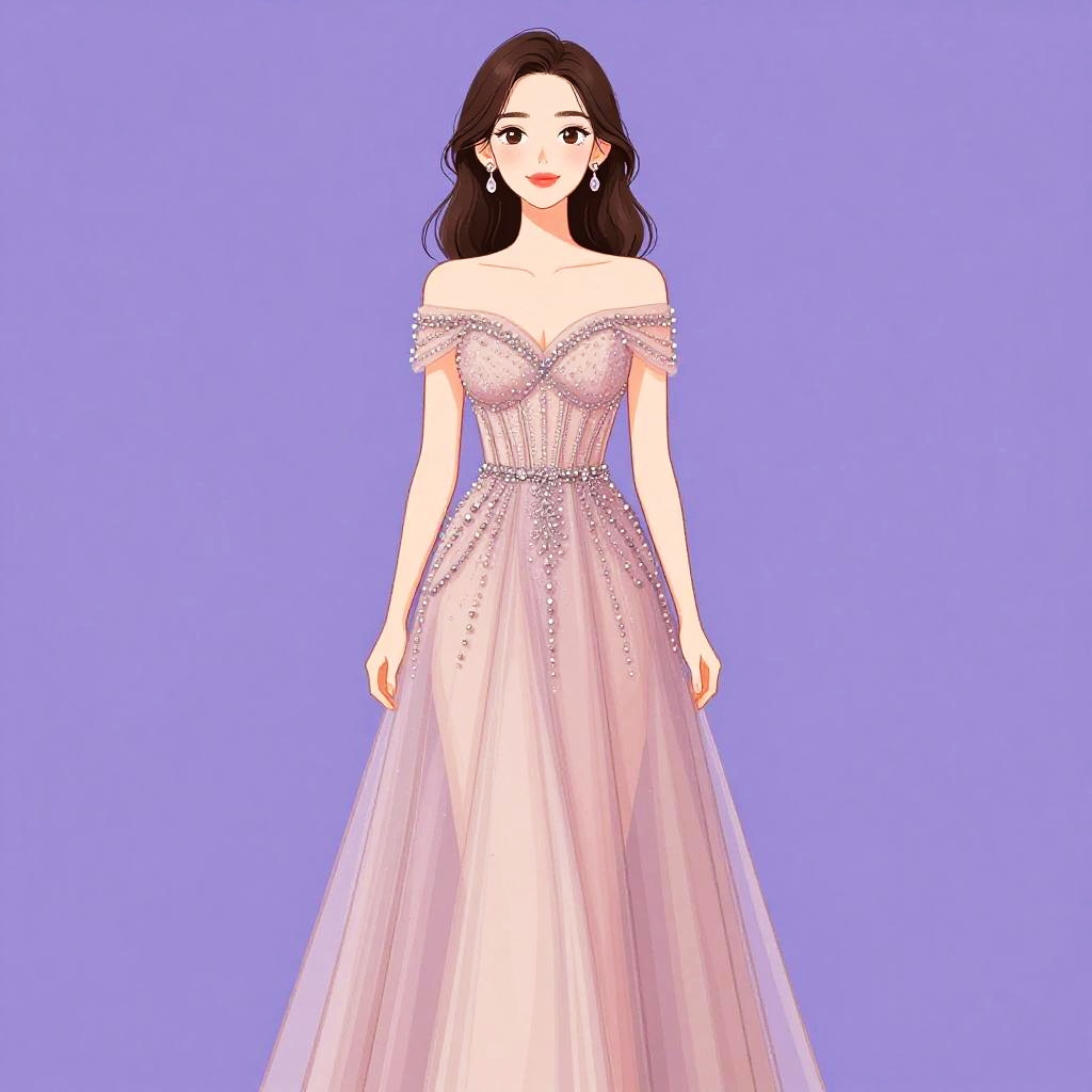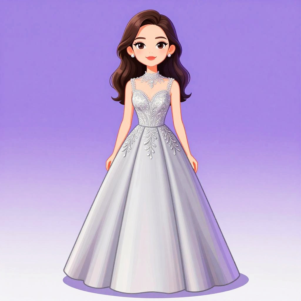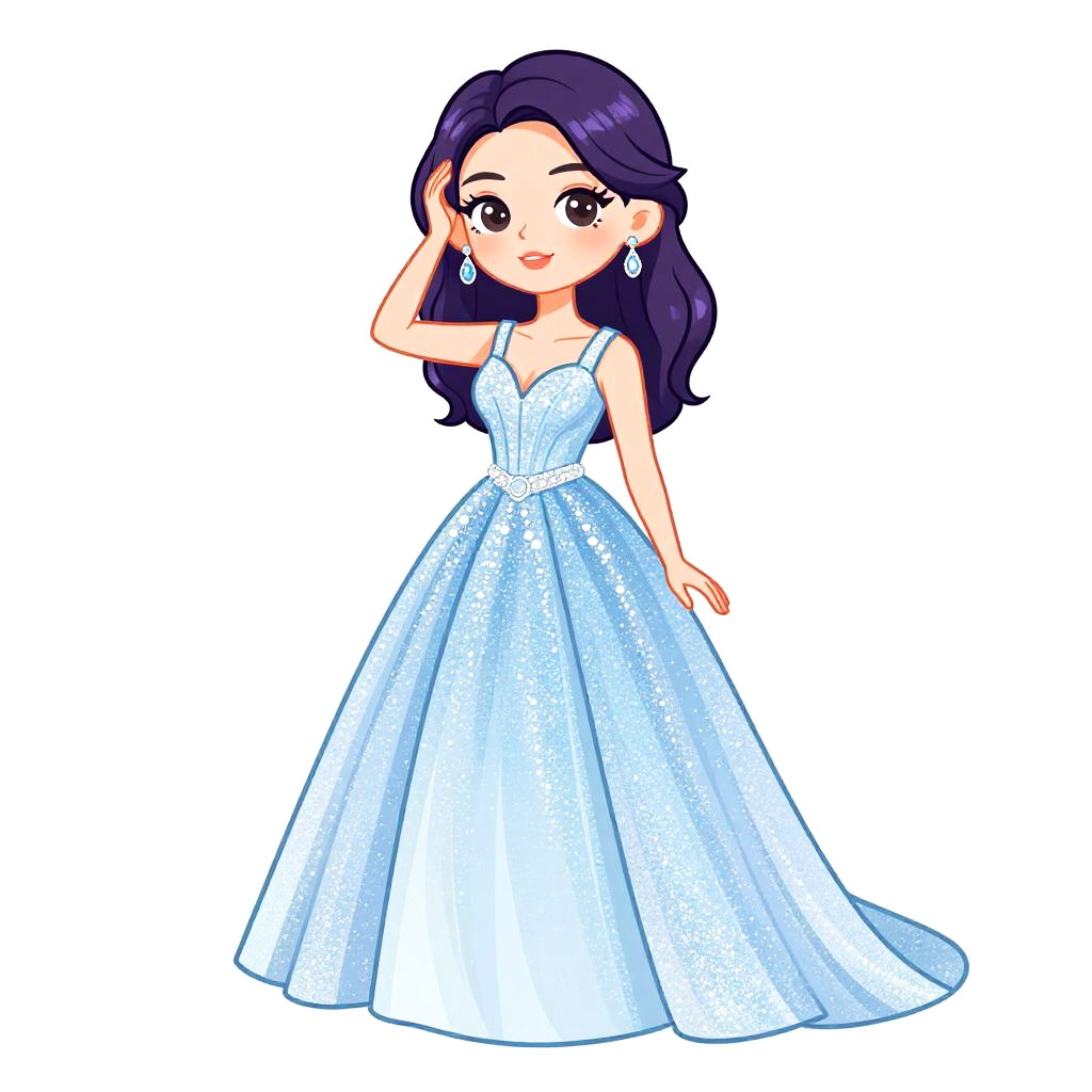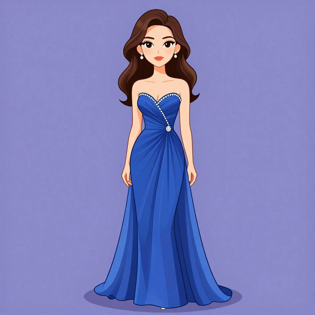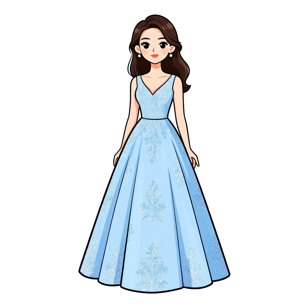 Woman with pretty face and pretty hair. Woman, classic elegance, A-line evening gown in sky blue, floral lace embroidery with shimmering details, V-neckline, sleeveless, fitted bodice, gently flared skirt from the waist, full-length, plain background --sref 1467