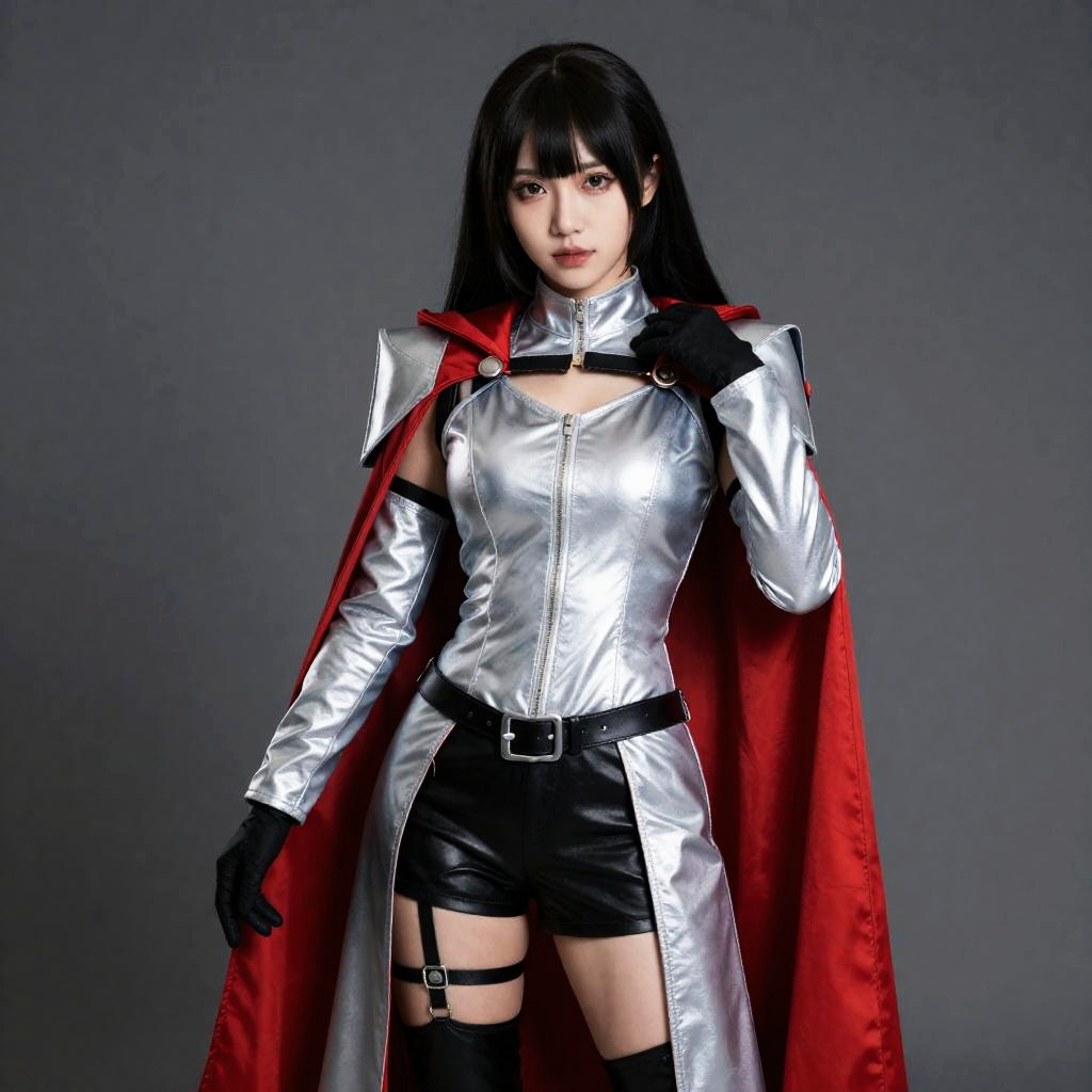 Omni Cosplay, dressed in a silver and black outfit and a red cape