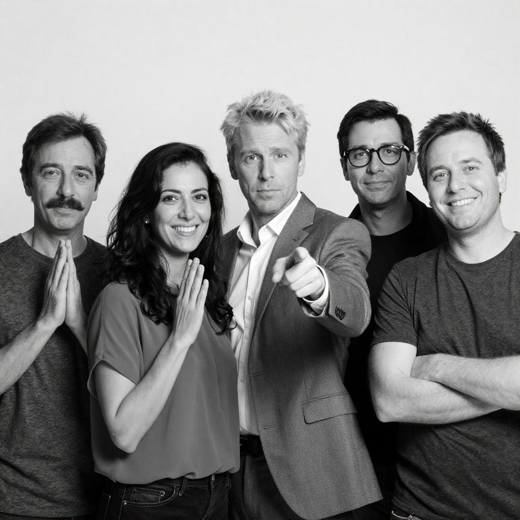 Photograph of six people, black and white image with orange band at bottom. Five men, one woman. Men have varied hairstyles and mustaches. Woman with short dark hair, smiling. Central man in suit, pointing forward. Rightmost man with glasses, leather jacket, smiling. Leftmost man with mustache, clasping hands. Background white. People stand in line, slightly leaning forward. Intense, defined facial expressions.