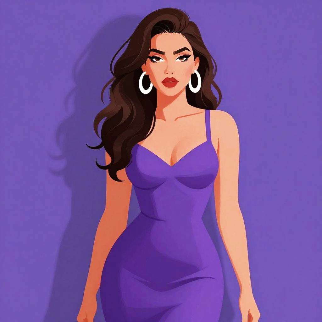 Digital illustration of a confident woman with long, wavy black hair and fair skin, standing against a solid purple background. She wears a form-fitting, sleeveless purple dress with a deep V-neckline, accentuating her curvy figure and moderate-sized breasts. Large white hoop earrings adorn her ears, and her bold red lipstick contrasts with her light complexion. Her dark eyebrows are slightly arched, and she gazes directly at the viewer with a slight smile. Her shadow is cast to the left, adding depth to the image. The style is vibrant and modern, with smooth, clean lines and vivid colors.