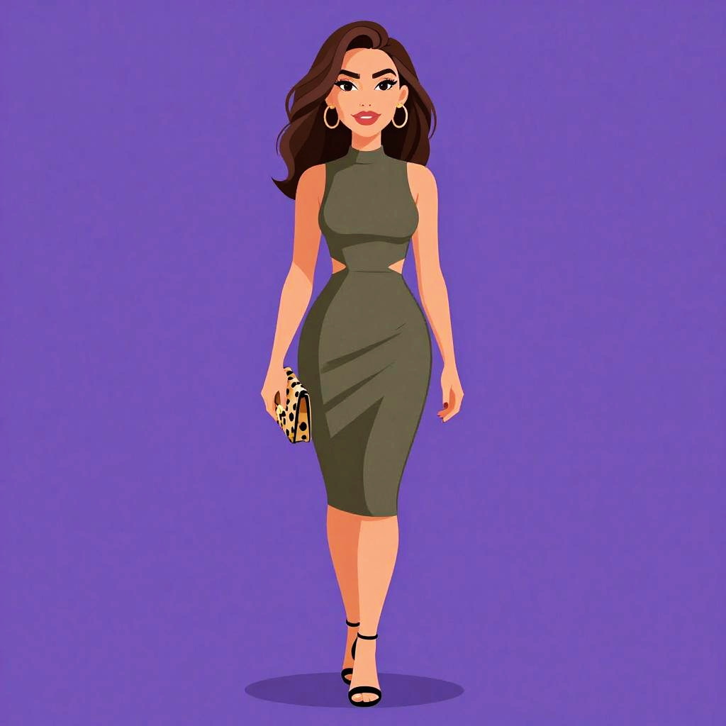 This digital illustration features a confident woman with long, wavy dark brown hair, wearing a tight, purple, V-neck dress that accentuates her curvy figure. She has large white hoop earrings and is standing against a solid purple background. Her expression is poised, and her makeup is bold, with dark eyeliner and red lipstick. The style is vibrant and cartoonish.