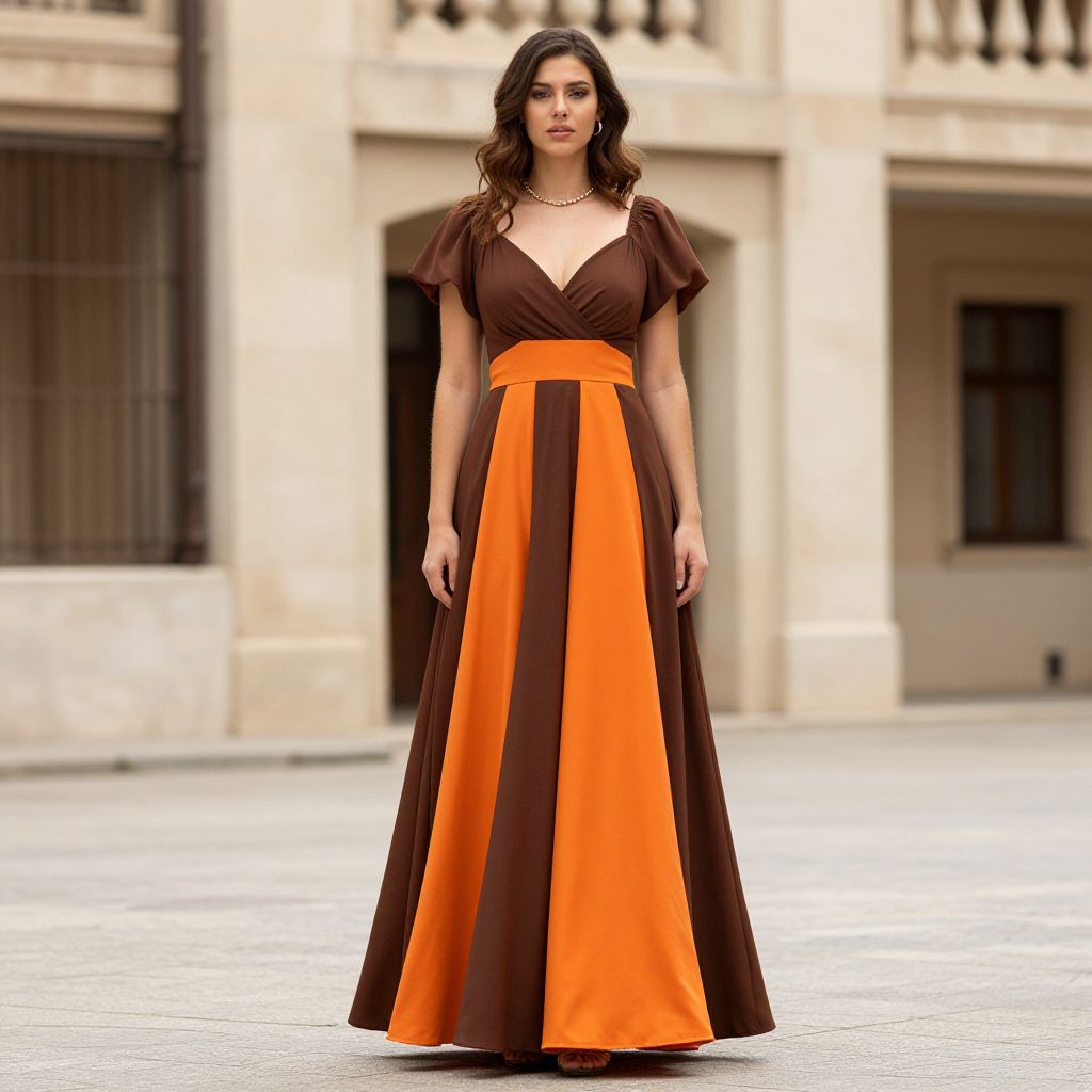 Photograph of a young woman with long, wavy brown hair and light skin standing outdoors against a blurred, beige stone building. She wears a floor-length, V-neck gown with short brown sleeves and a high-waisted, bright orange skirt that contrasts with the dark brown bodice. A thin orange belt cinches the waist. She has a neutral expression and wears a simple necklace. The background includes vertical window frames and a balustrade, suggesting an urban setting. The overall style is modern and elegant, with a focus on bold color contrasts.
