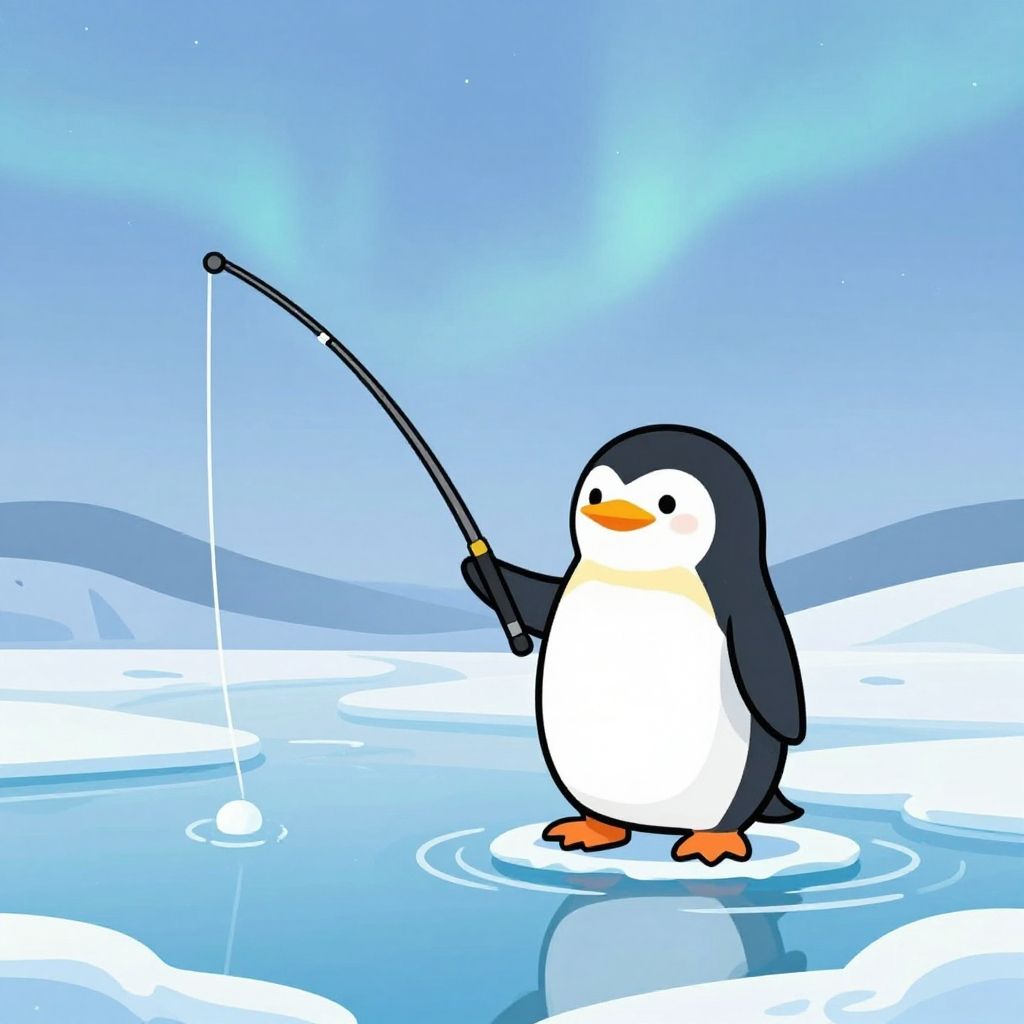 2d penguin fishing on frozen lake, holding a fishing rod, stylized cartoon, crisp and clean lines, soft gradient background with subtle northern lights effect, tranquil and serene scene