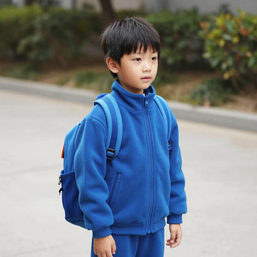 Photograph of a young Asian boy with short, dark brown hair standing against a plain white background. He is wearing a bright blue, zip-up hooded jacket and matching blue pants. He has a black backpack with adjustable straps over his shoulders. The boy's expression is neutral, looking slightly to the right of the camera. The image has high contrast and vivid colors, emphasizing the blue of his clothing. The white background makes the boy and his clothing stand out prominently.