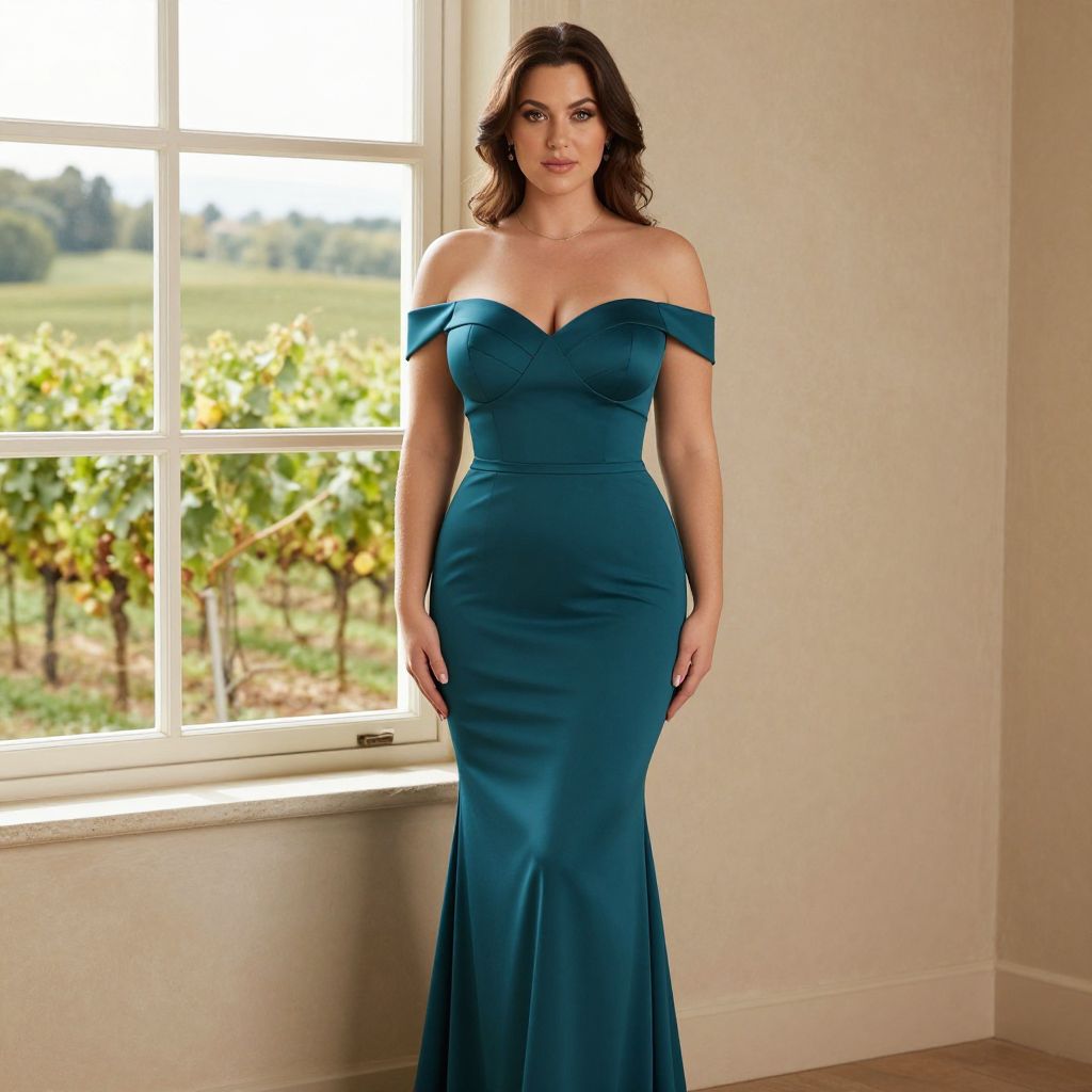 A Curvy woman, elegant evening wear, teal mermaid gown, off-the-shoulder with straps, sweetheart neckline, fitted to the knees with a slight flare at the bottom, minimal accessories, simple wavy hair, scenic vineyard terrace, Window light, soft glow, natural ambiance Sexy. Pretty face and beаutiful eyes. Big breasts
