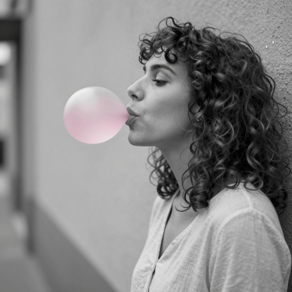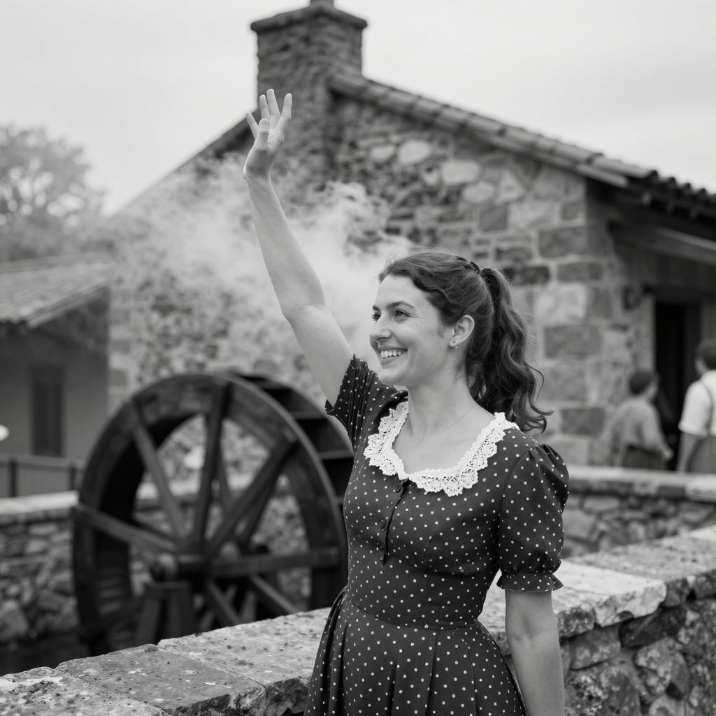 Black and white photograph of a woman running on a dark road at night. She has short curly hair, wears a belted dress, raises her right arm, and smiles. The road has a white line on the right. Grassy verge on the left. Dark, empty background.