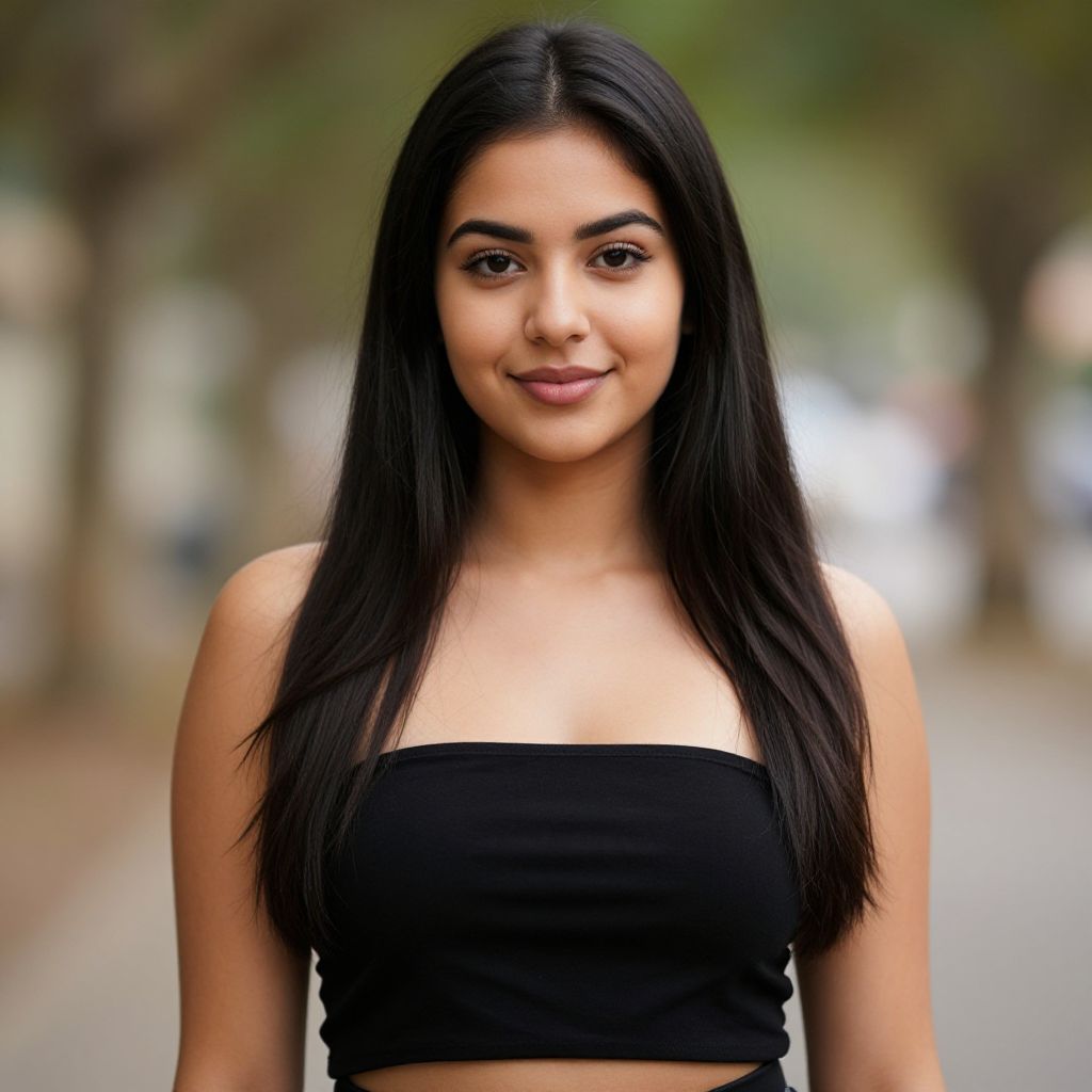 Photograph of a confident woman with long dark hair and olive skin, standing in a bustling city street. She's wearing a white lace halter top that reveals her cleavage and a black high-waisted skirt. Her makeup is bold, with dark eyeliner and pink lipstick. She's accessorized with hoop earrings and a small necklace. The background is blurred, showing people walking and colorful buildings.