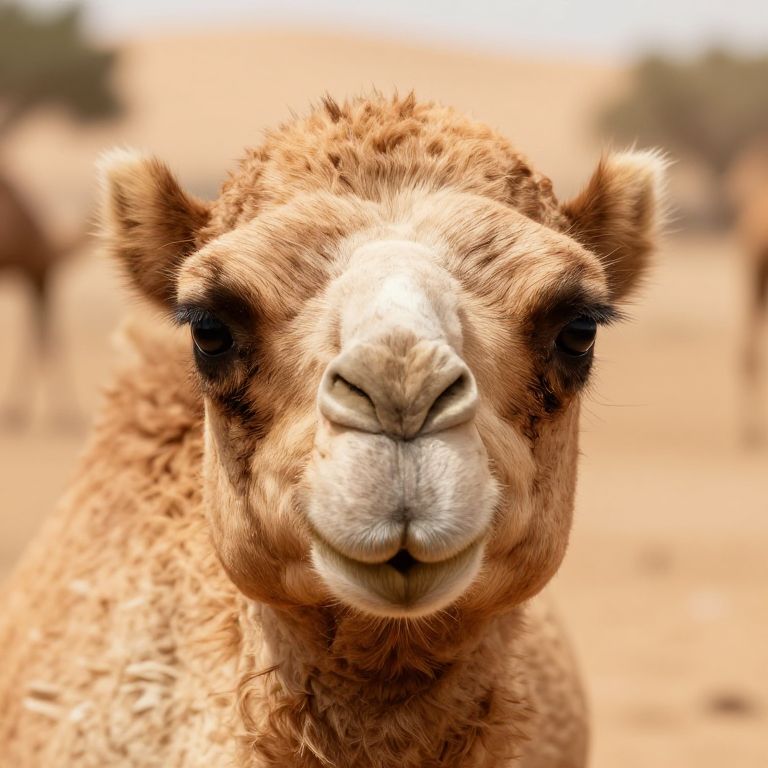 Close-up of camel's face with detailed fur texture, large expressive eyes, soft natural lighting highlighting the contours, desert background blurred, focus on calm and wise expression, photorealistic style, warm earthy tones.