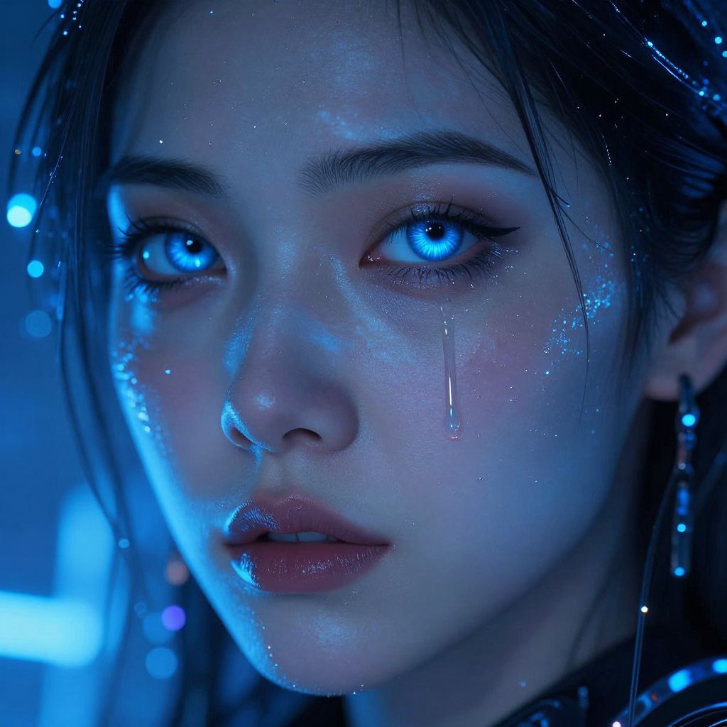 Digital portrait of a crying young Asian woman with glowing blue eyes, wet skin, and dark hair, illuminated by blue light. Tears streak her face,