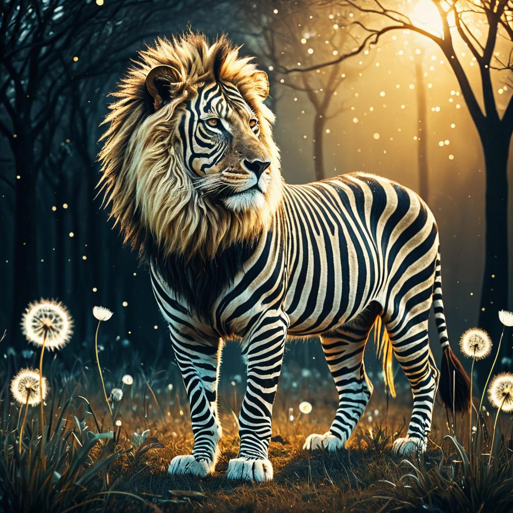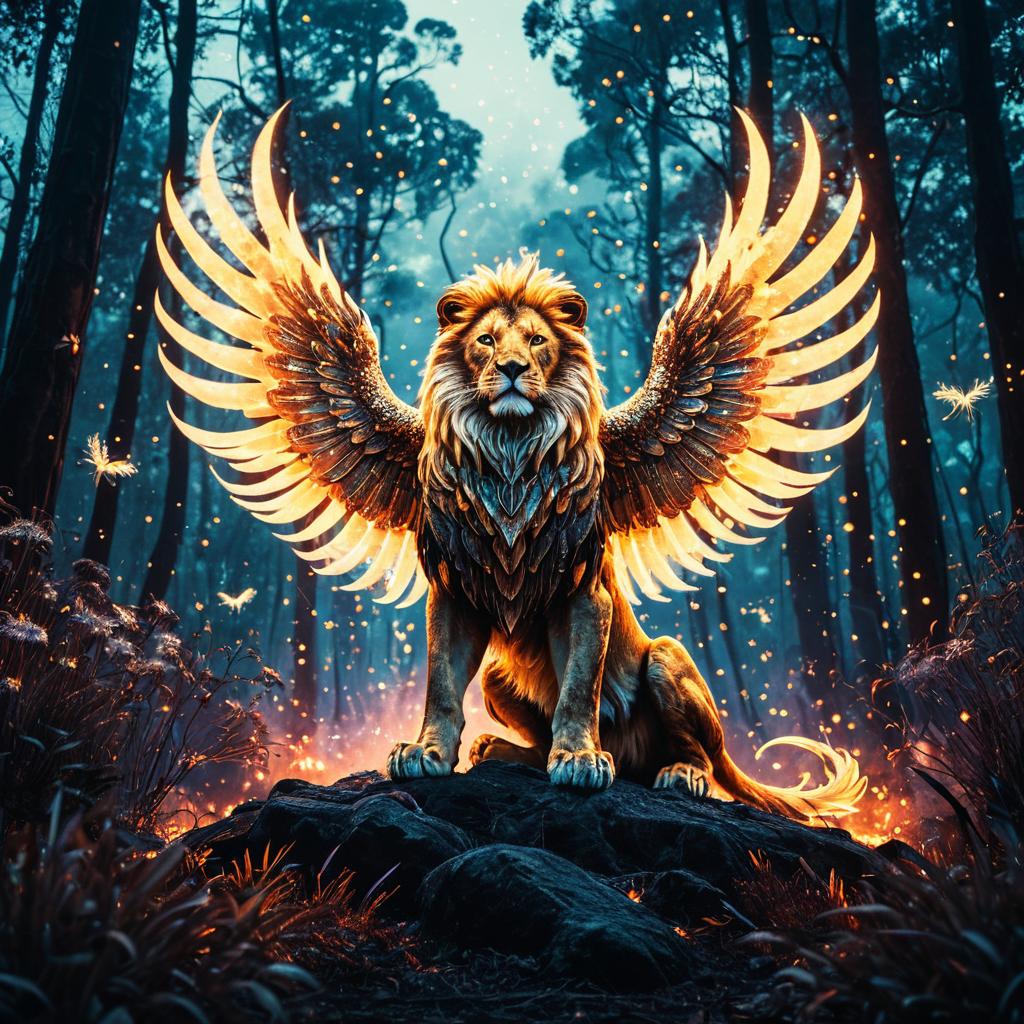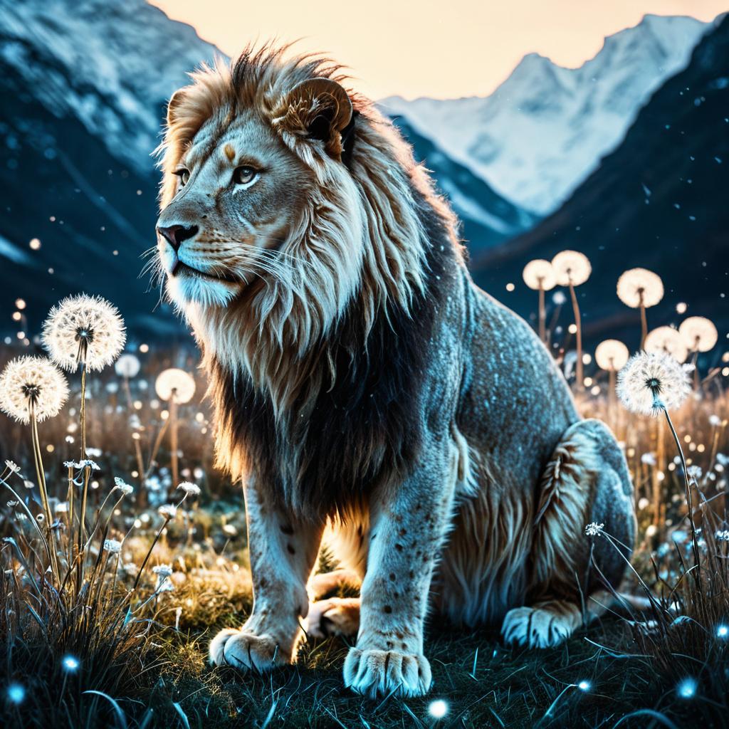 The whimsical and dreamlike, using soft colors and smooth textures image shows a stylized illustration of a surreal chameleon creature. Imagination takes form in a mysterious and hyper-detailed depiction of a full-body lion creature with ethereal neon light, skin with tiny luminescent fern patterns, slightly blurred bioluminescent rainforest, all highlighted with a perfect golden hue and white neon light dandelions. The overall image is in the style of Maria Sibylla Merian. Lion stands in the center of the composition, creating an ethereal atmosphere. 8k artistic photography details, ultra-detailed realistic portrait