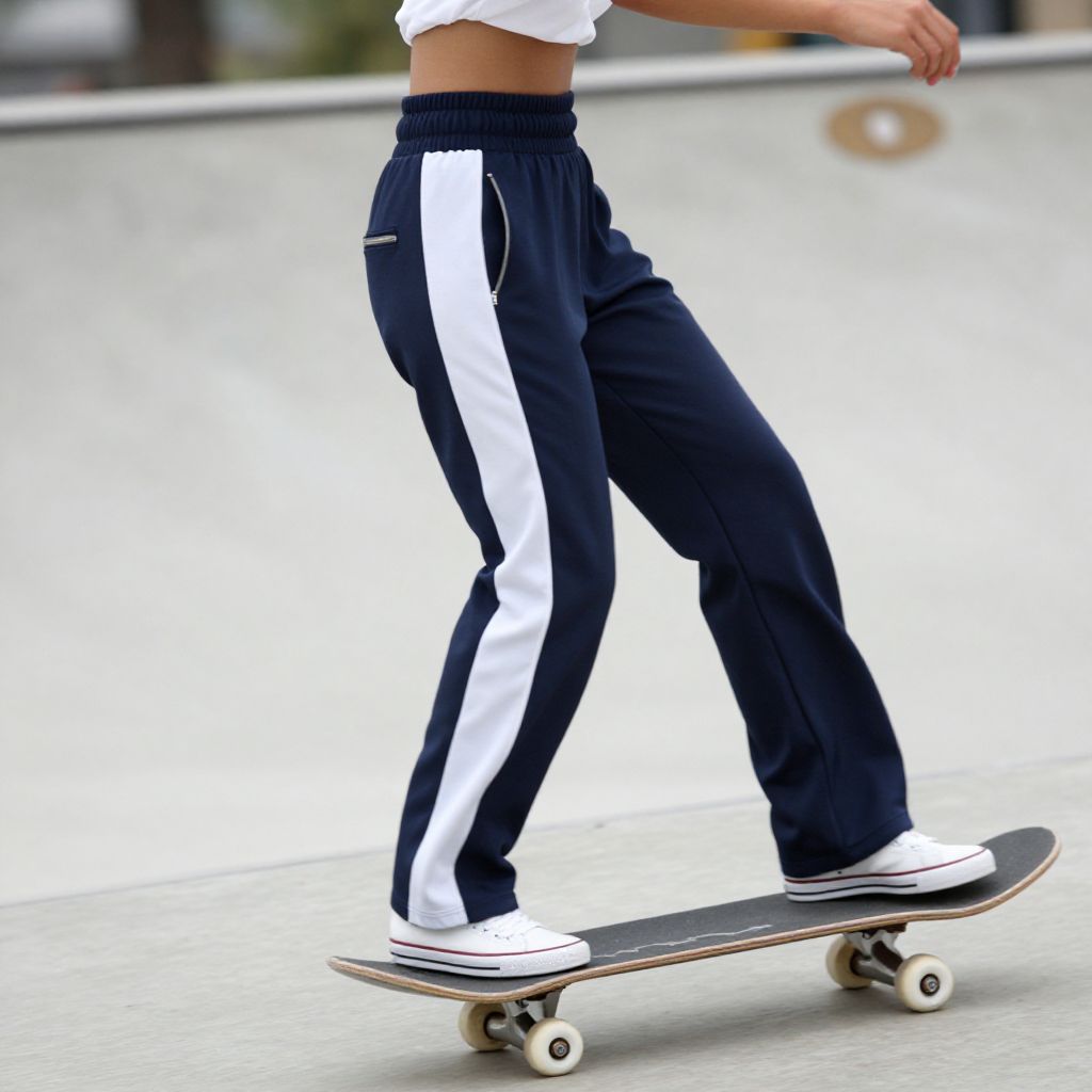 Streetwear track pants in a retro 90s style, high waist with a zippered pocket, navy blue with white stripes, model wearing them while skateboarding in a park, mid-action shot, dynamic angles, realistic photography with motion blur and depth of field