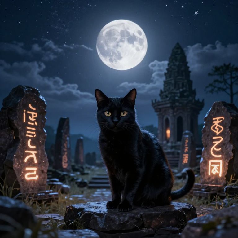 A digital artwork depicts a black cat with glowing green eyes sitting on a stone in a nighttime graveyard. The full moon, bright and luminous, hangs in the starry sky above. Ancient, dark stone ruins and tall, weathered tombstones with illuminated runes in a mysterious script flank the cat. The runes on the tombstones glow in a soft orange light, contrasting with the dark, shadowy background. The cat's sleek fur and alert posture add a sense of mystery and intrigue to the hauntingly beautiful scene.
