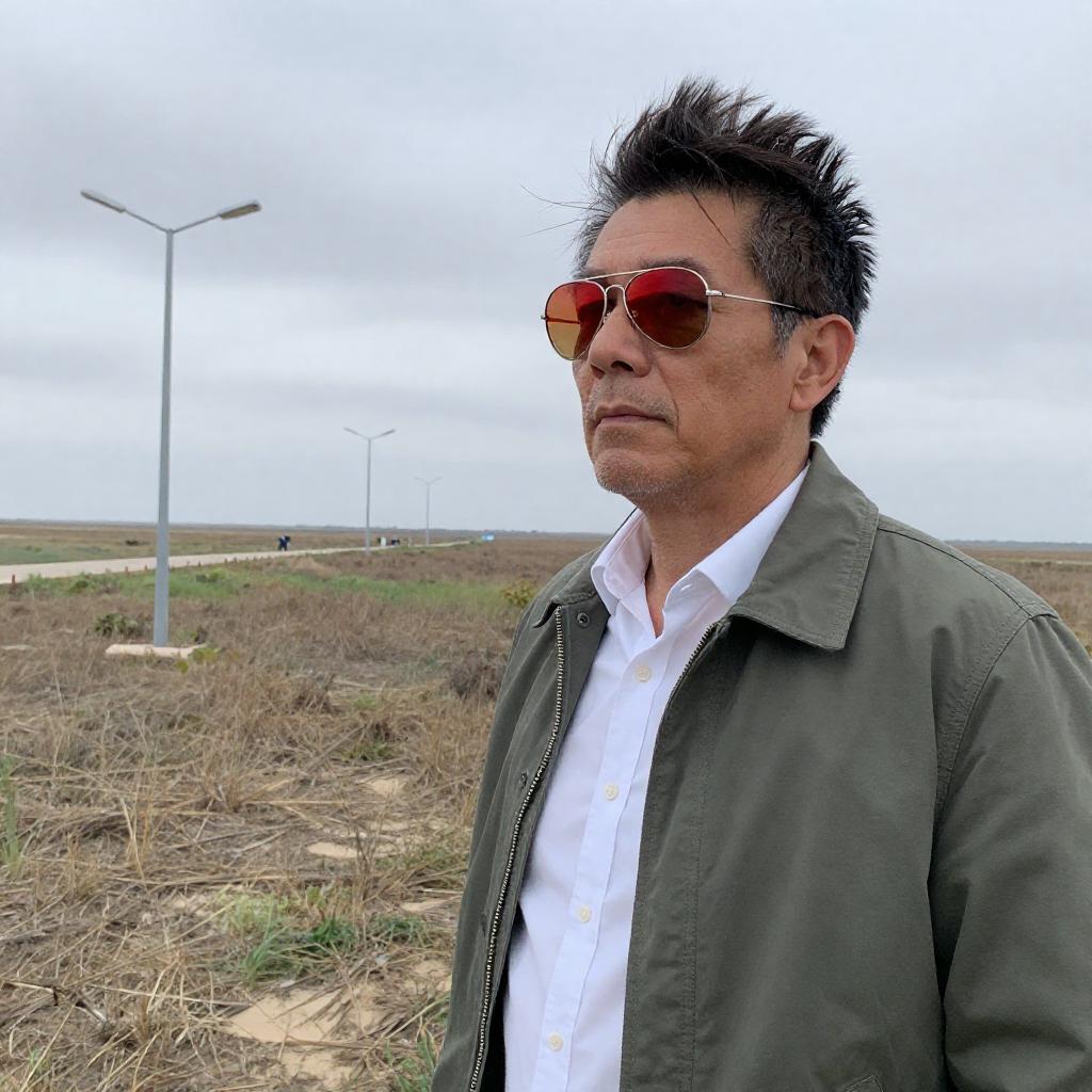 Middle-aged man with spiked dark hair, red-tinted aviator sunglasses, green jacket, white shirt, outdoors, overgrown field, lampposts in background, cloudy sky, slight wind in hair, focused expression, semi-deserted area, few scattered objects in distance.