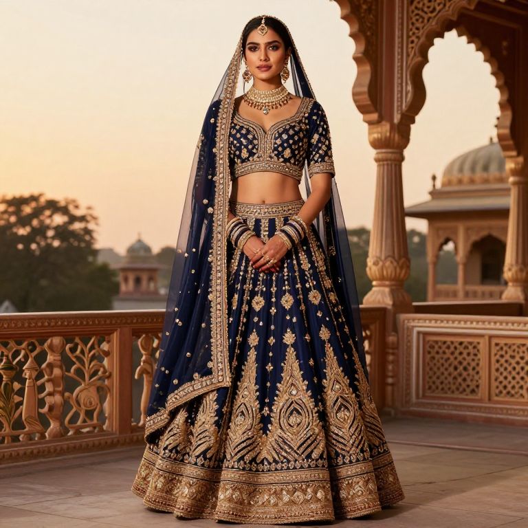 A bold and confident bride with dark brown eyes and smooth golden-brown skin dressed in a majestic Rajputi lehenga design with heavy gold embroidery, deep navy base color, and a full, layered choli with a zari border, posing in a royal palace balcony at sunset, with traditional Rajasthani art motifs in the background, high-resolution realistic photo.