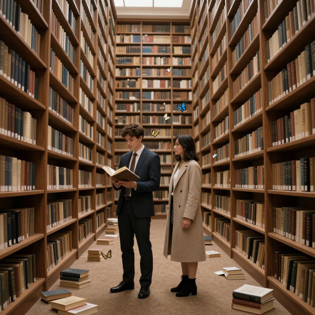 Books flutter gracefully between towering shelves in a grand library, as two individuals—a man in a suit holding an open book and a woman in a coat—stand amidst a carpeted aisle, surrounded by floating butterflies and scattered volumes, creating an ethereal atmosphere of knowledge and wonder.