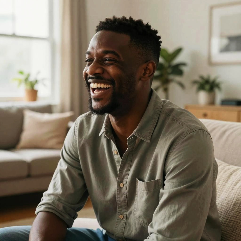 Black man laughing freely in a cozy living room setting, natural morning light from window, comfortable modern furniture, plants in the background, wearing a casual shirt, genuine and infectious smile, warm and inviting scene, detailed textures and soft shadows.