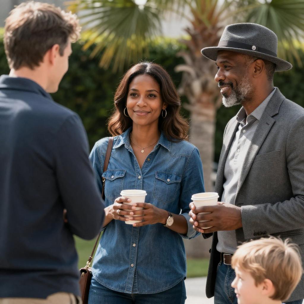 Photograph of a middle-aged white man and a black woman sitting on a white, studded sofa in a sunlit, brick-walled living room. The man wears a gray blazer, white shirt, and dark pants, holding a glass of whiskey. The woman, in a black coat and hat, also holds a glass of whiskey. A blue pillow and a decorative pillow with a floral pattern are on the sofa. A bottle of whiskey and a glass are on a wooden coffee table in front of them.