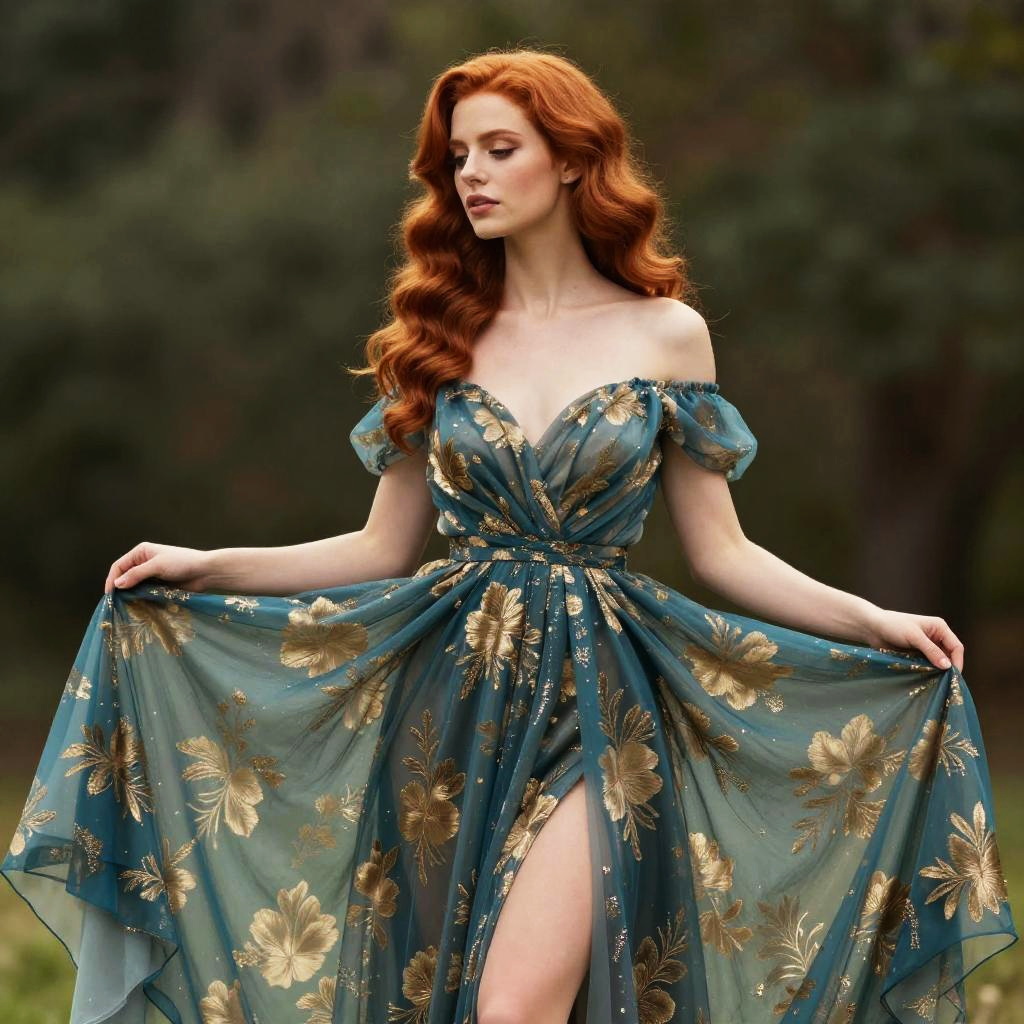 Photograph of a beautiful redhead woman with wavy hair, standing outdoors in a blurred, forested background. She's wearing an off-the-shoulder, teal and gold floral dress with a sheer, flowing skirt. Her dress is slightly shimmering and she's holding it out with both hands. Her skin is fair, and she has a serene, focused expression. The lighting is soft, highlighting her elegant features.