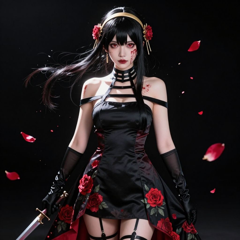 Spy x family style, yor briar, 1girl, backlighting, bare shoulders, black background, black dress, black gloves, black hair, blood, blood on face, blood on weapon, breasts, closed mouth, cowboy shot, dress, earrings, expressionless, gloves, floating hair, floral print, flower, gold earrings, gold hairband, hair flower, hair ornament, hairband, jewelry, large breasts, light particles, long hair, looking at viewer, off-shoulder dress, off shoulder, petals, red eyes, rose, rose petals, rose print, short hair with long locks, sidelocks, solo, spikes, thighs, two-sided dress, two-sided fabric