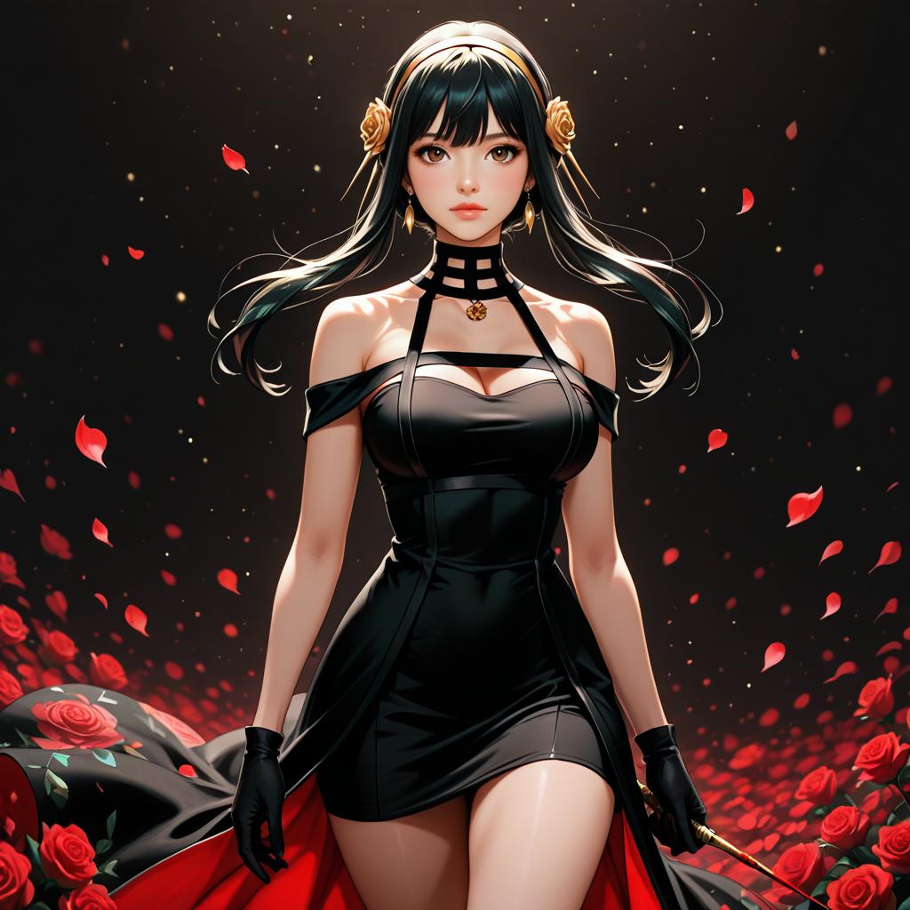 Digital art of a beautiful Asian woman with long black hair, adorned with gold flower hairpins, standing in a field of red roses. She wears a tight, black, off-shoulder, halter-neck dress with a heart-shaped cutout, black gloves, and a choker. Her large, expressive eyes and red lipstick contrast with her pale skin. Black and red petals float around her, and the background is a dark, starry sky. The overall style is anime-inspired with a gothic, romantic theme, featuring bold colors and sharp, detailed lines.