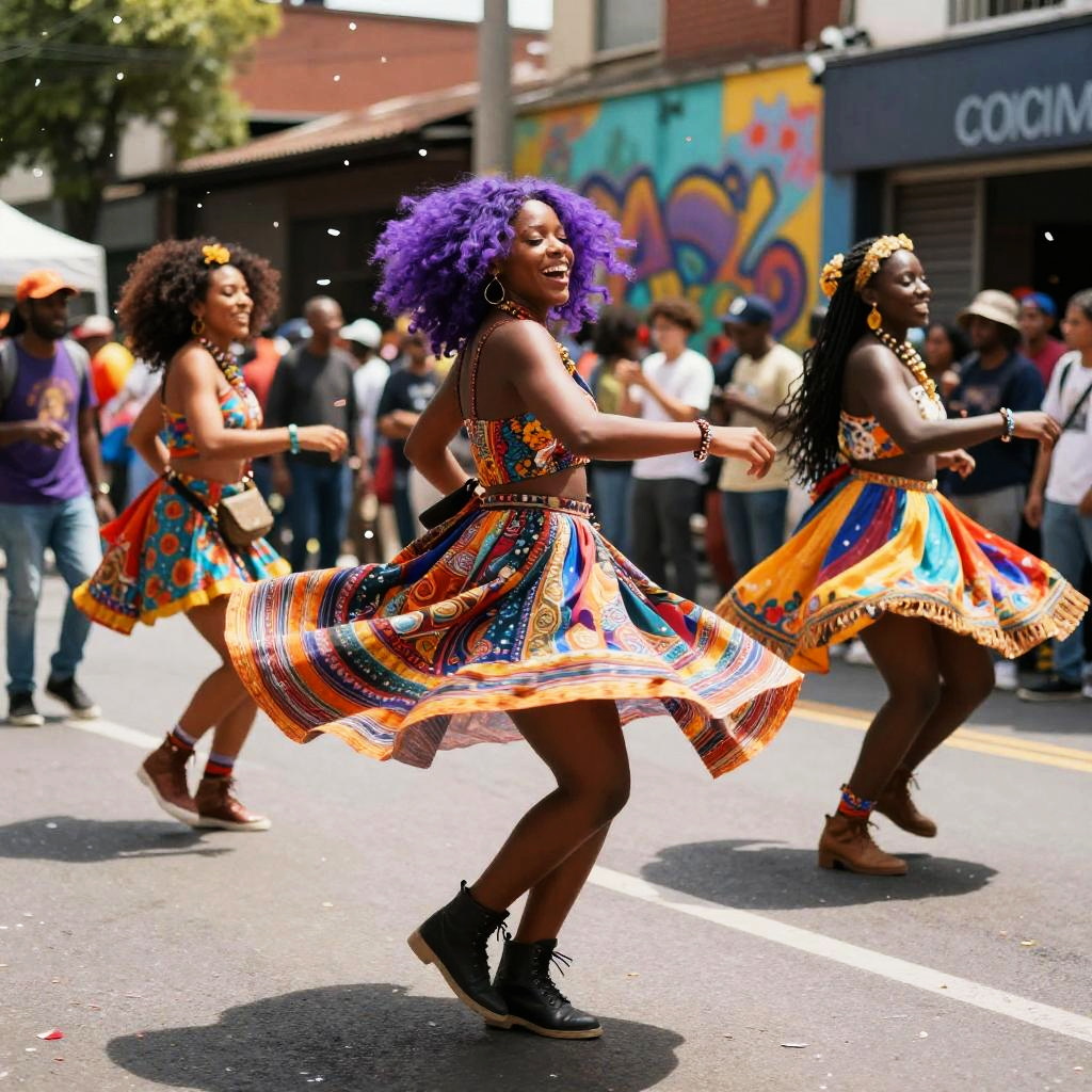 Black women with purple hair dancing joyfully in a colorful street festival, vibrant fabrics swirling around, dynamic movement captured mid-spin, bright confetti raining down, urban backdrop with graffiti art, celebration of culture and individuality